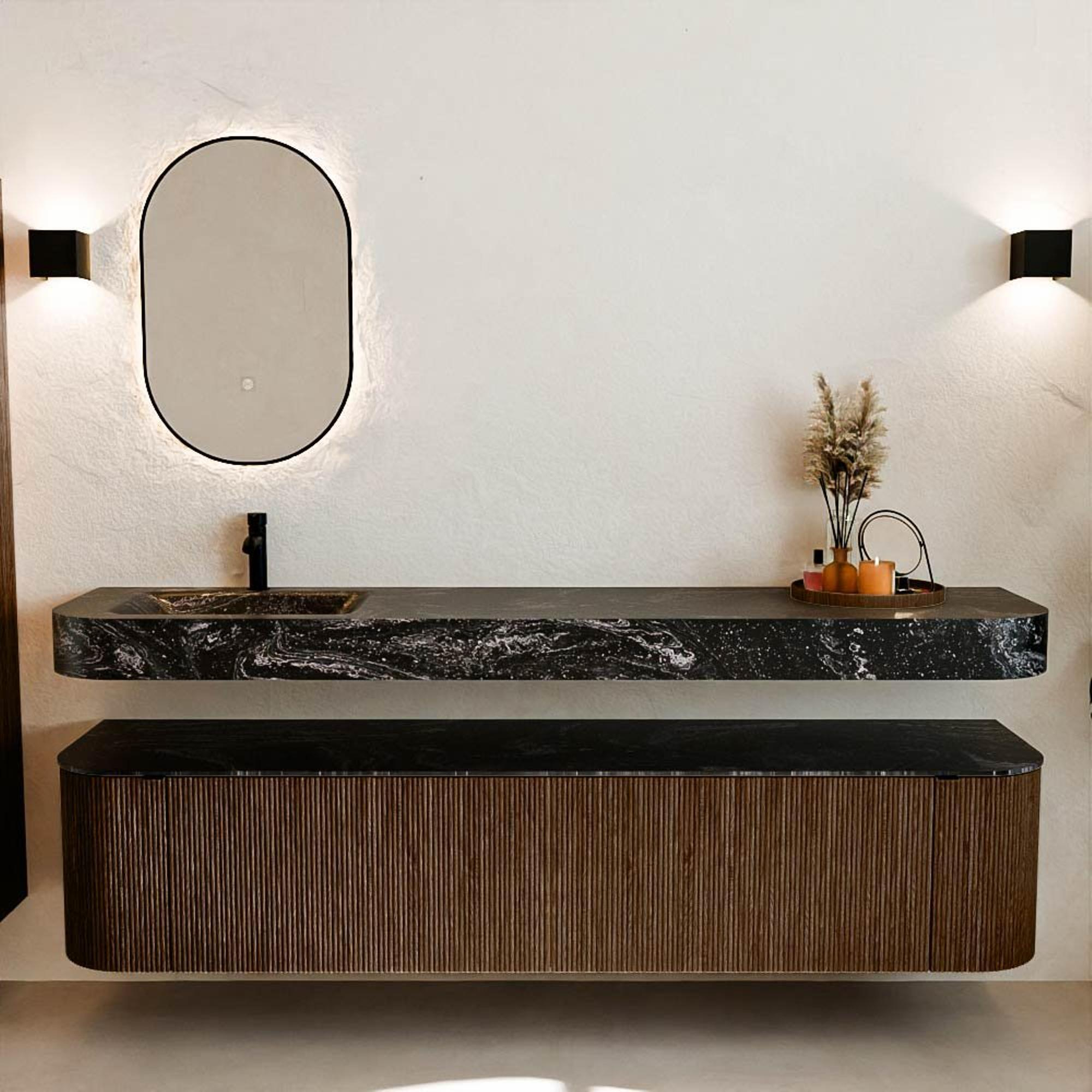 MONDIAZ THOR-DLUX 200cm badmeubel ronding links + rechts kleur Walnut met 2 lades en 2 deuren. Vrijhangende wastafel CLOUD Links 1 kraangat kleur Lava.