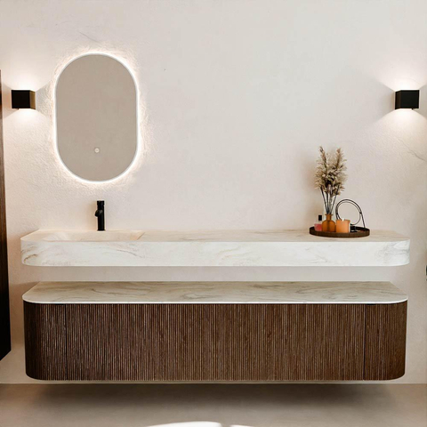 MONDIAZ THOR-DLUX 200cm badmeubel ronding links + rechts kleur Walnut met 2 lades en 2 deuren. Vrijhangende wastafel CLOUD Links 1 kraangat kleur Ostra.