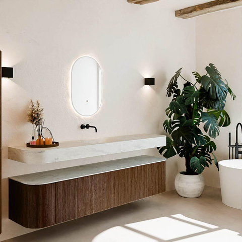 Natuurlijke materialen in warme tinten. De verticale ribbels brengen ritme en textuur in het ontwerp, terwijl het eikenhout zorgt voor een warme, ambachtelijke uitstraling. Kies uit 5 houttinten OAK, WALNUT, DUSK, SHADOW en RUBY zorgvuldig geselecteerde houtkleuren om zowel moderne als klassieke badkamers te verrijken.