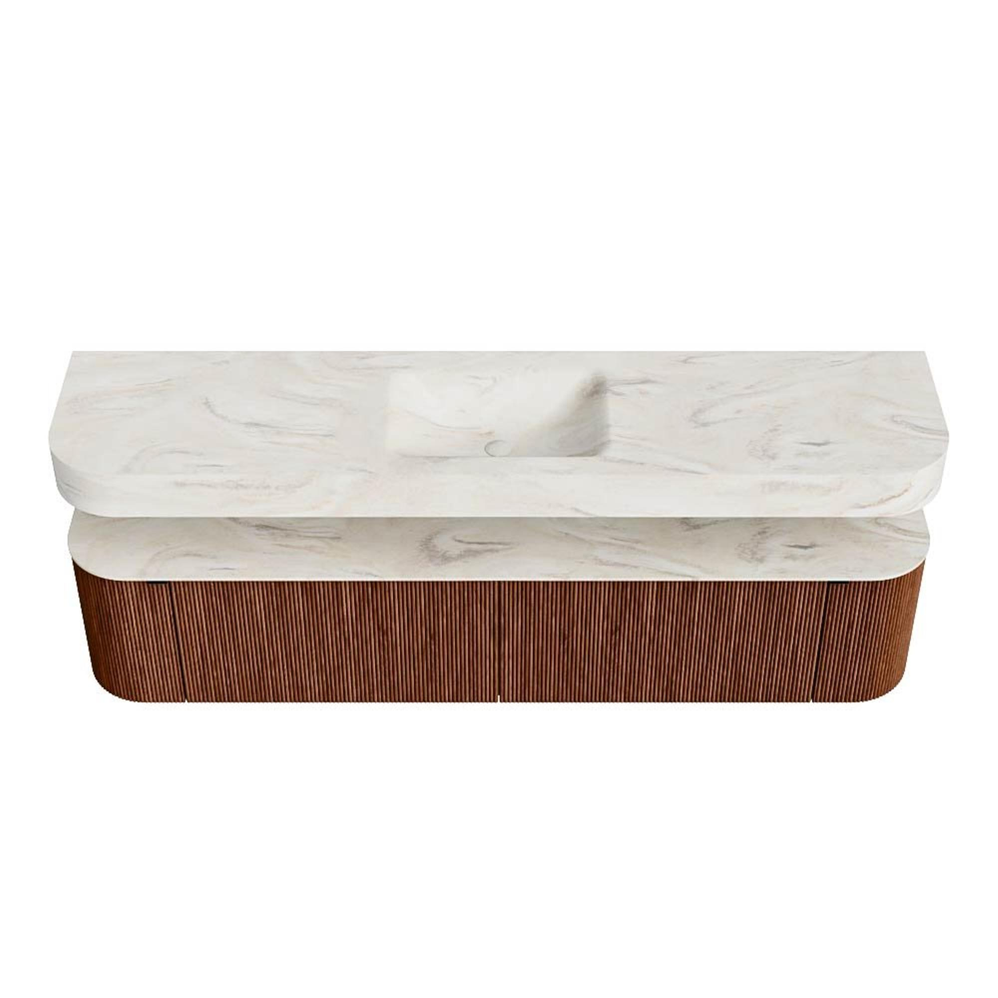 MONDIAZ THOR-DLUX 200cm badmeubel ronding links + rechts kleur Ruby met 2 lades en 2 deuren. Vrijhangende wastafel CLOUD Midden 1 kraangat kleur Ostra.