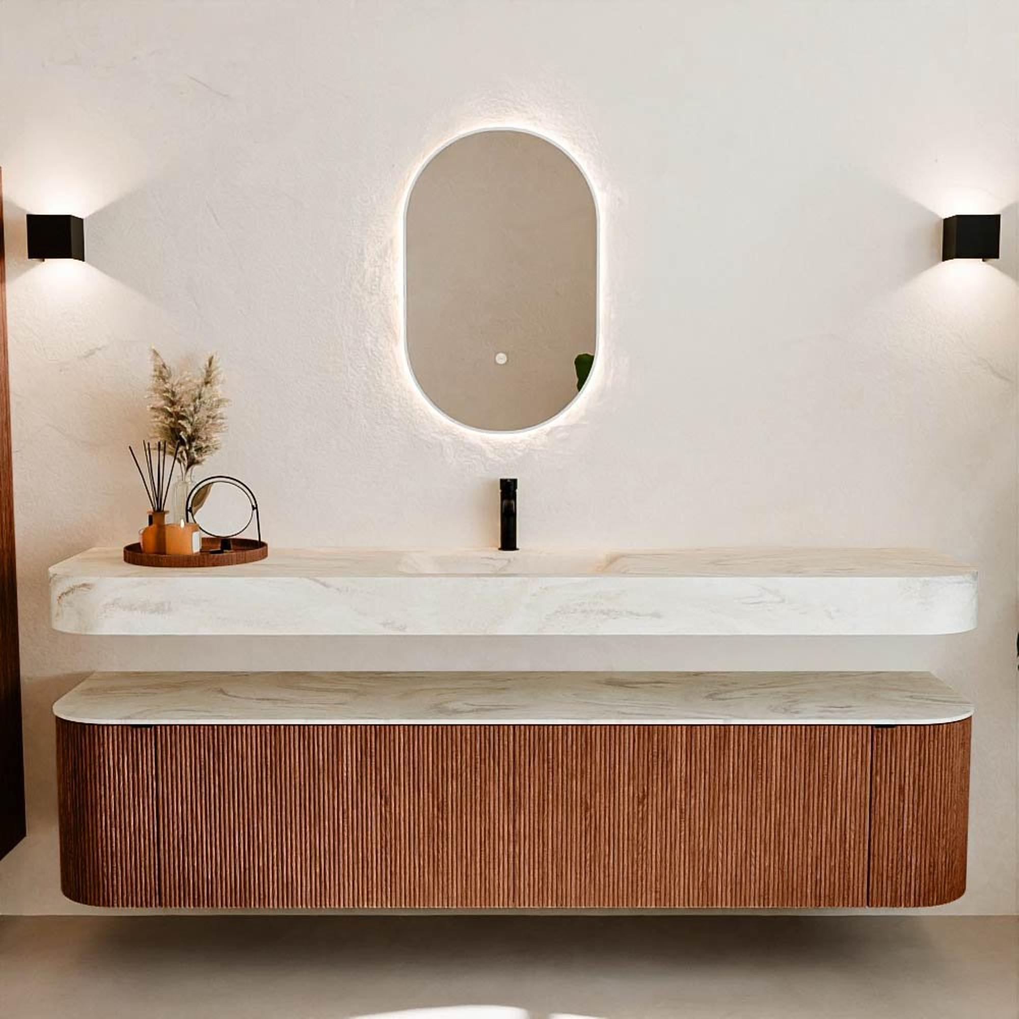Natuurlijke materialen in warme tinten. De verticale ribbels brengen ritme en textuur in het ontwerp, terwijl het eikenhout zorgt voor een warme, ambachtelijke uitstraling. Kies uit 5 houttinten OAK, WALNUT, DUSK, SHADOW en RUBY zorgvuldig geselecteerde houtkleuren om zowel moderne als klassieke badkamers te verrijken.