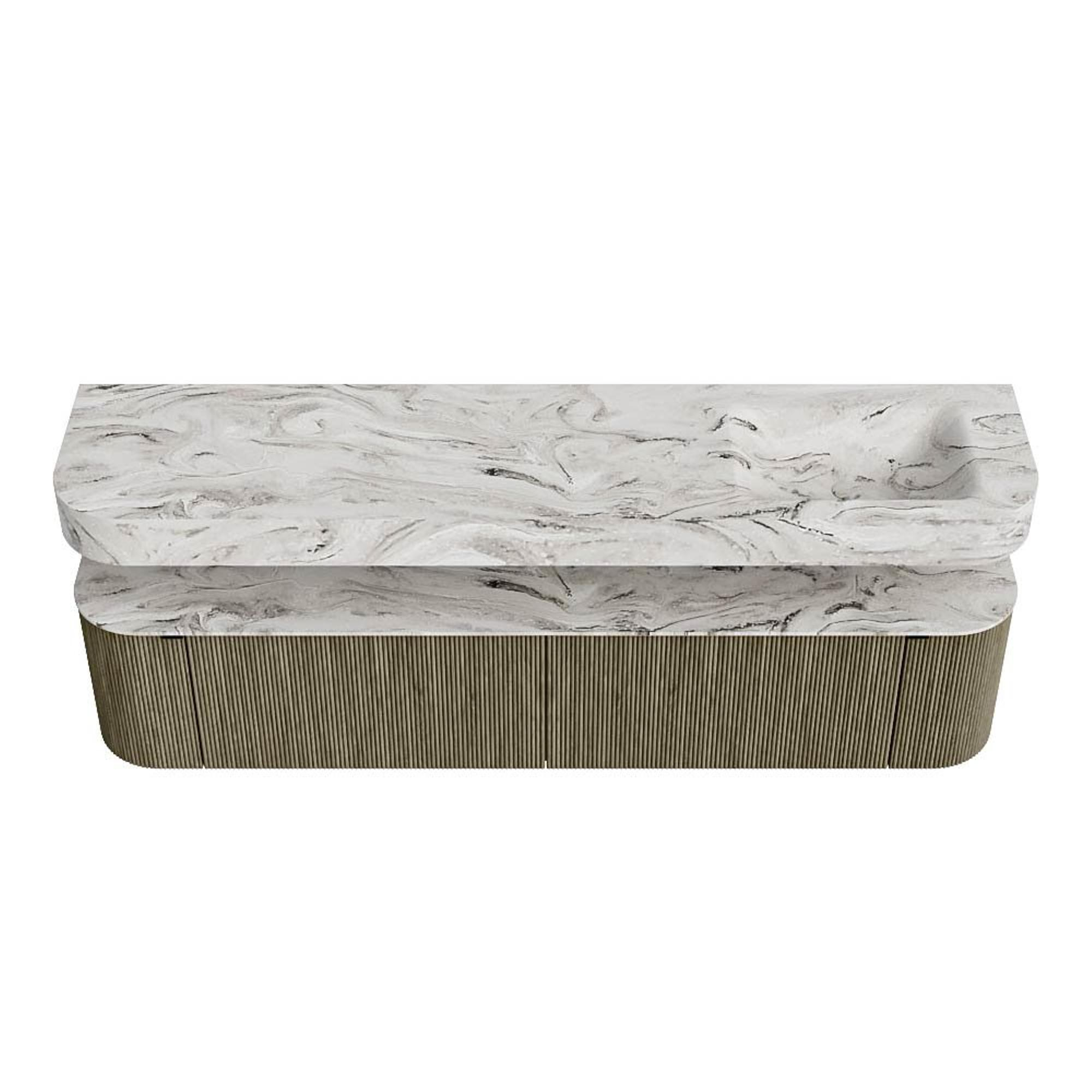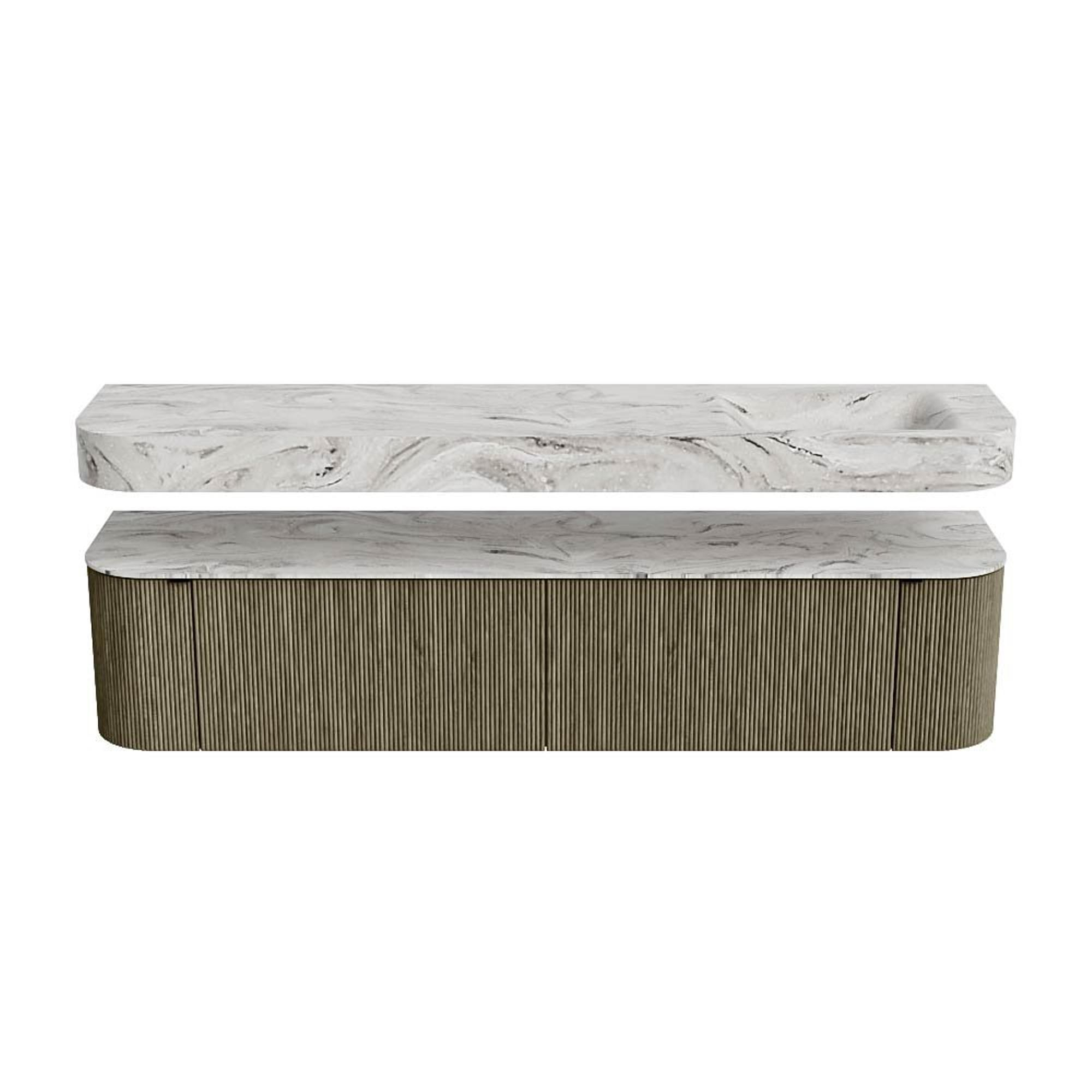 MONDIAZ THOR-DLUX 200cm badmeubel ronding links + rechts kleur Shadow met 2 lades en 2 deuren. Vrijhangende wastafel CLOUD Rechts 1 kraangat kleur Glace.