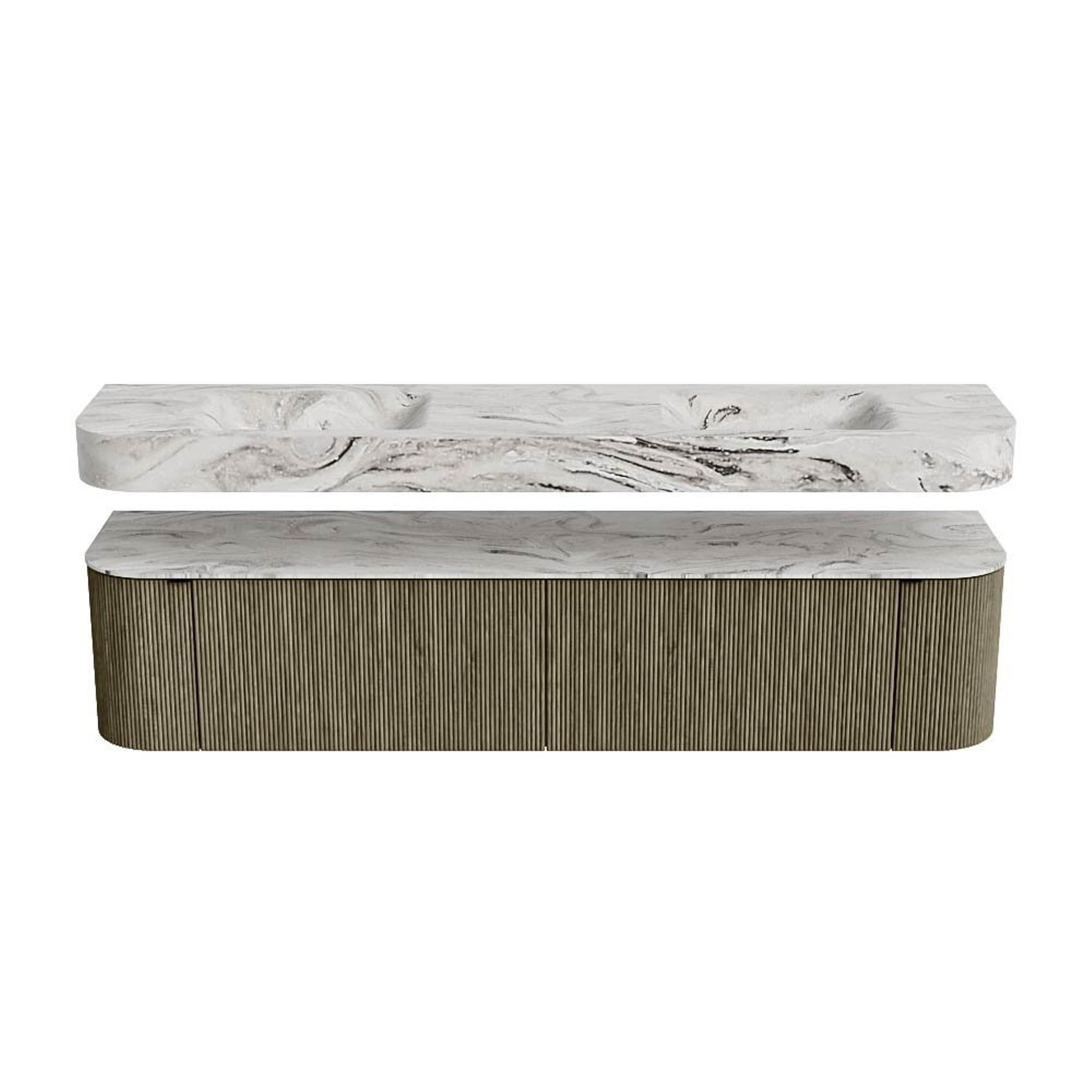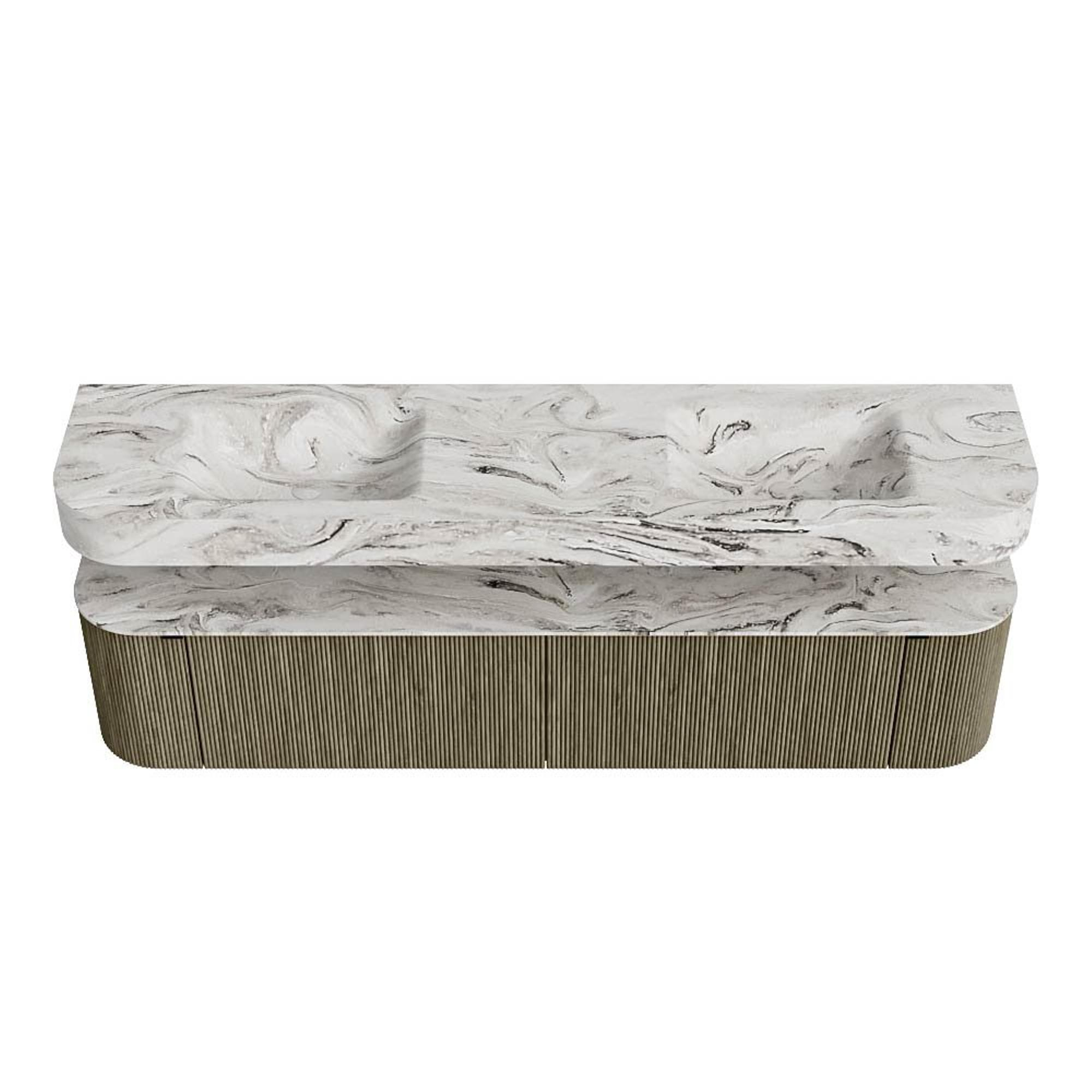 MONDIAZ THOR-DLUX 200cm badmeubel ronding links + rechts kleur Shadow met 2 lades en 2 deuren. Vrijhangende wastafel CLOUD Dubbel zonder kraangat kleur Glace.