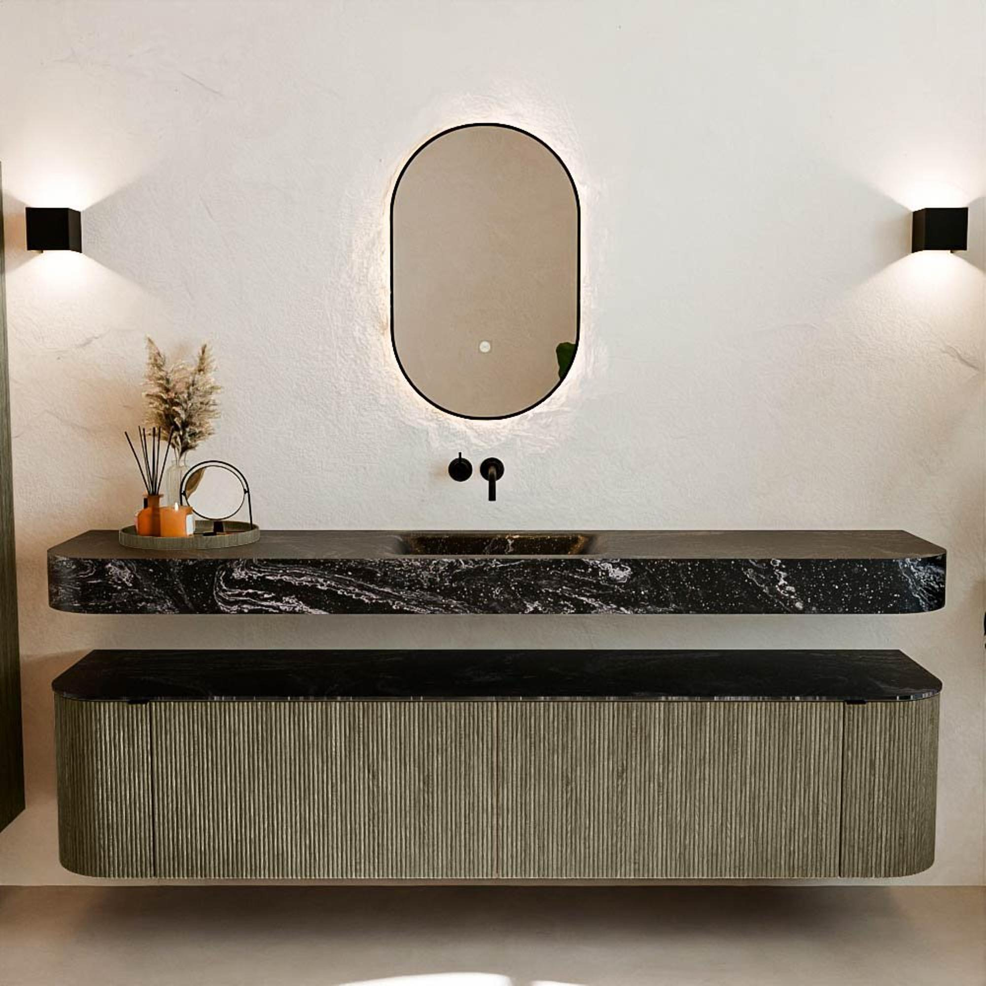 MONDIAZ THOR-DLUX 200cm badmeubel ronding links + rechts kleur Shadow met 2 lades en 2 deuren. Vrijhangende wastafel CLOUD Midden zonder kraangat kleur Lava.