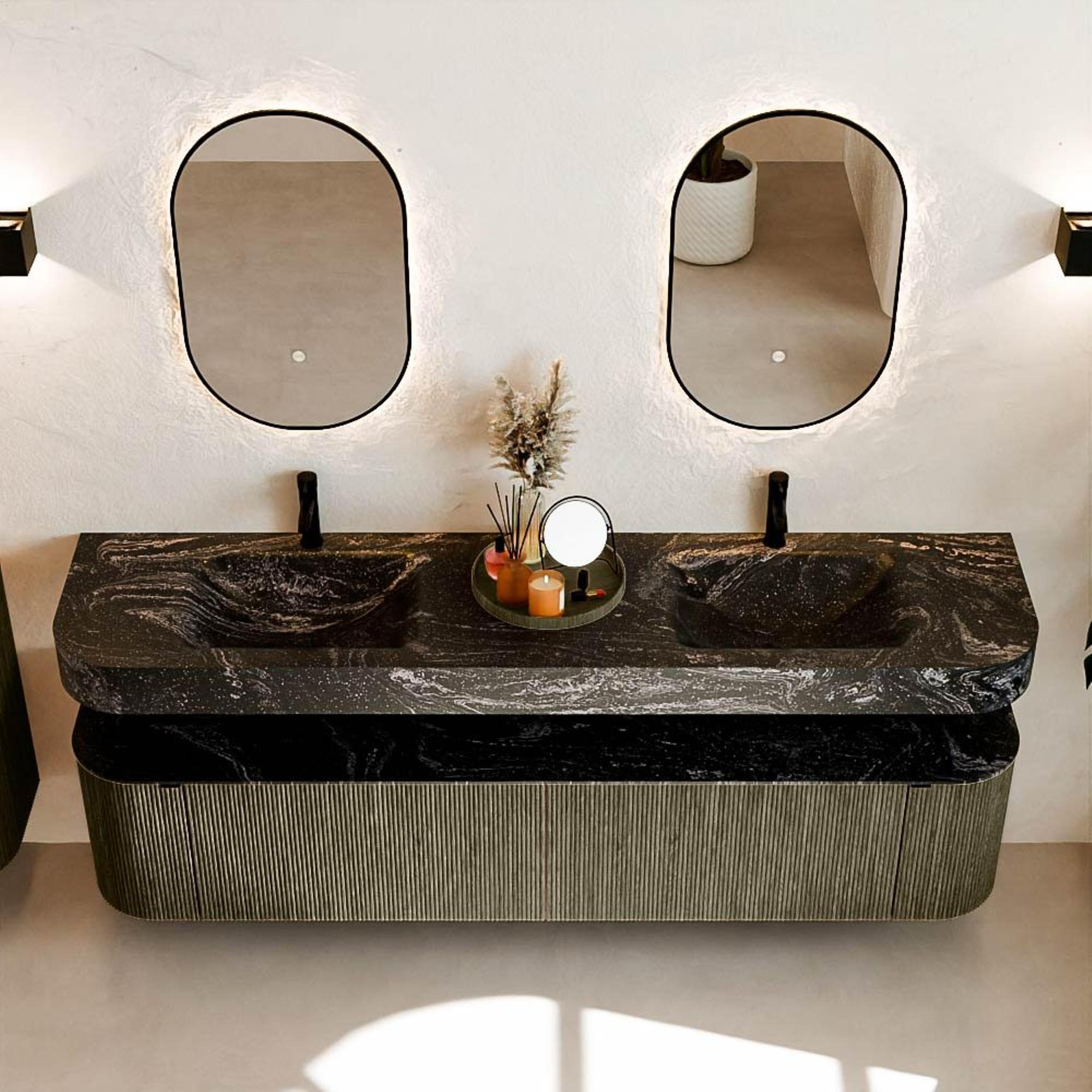 MONDIAZ THOR-DLUX 200cm badmeubel ronding links + rechts kleur Shadow met 2 lades en 2 deuren. Vrijhangende wastafel CLOUD Dubbel 2 kraangaten kleur Lava.