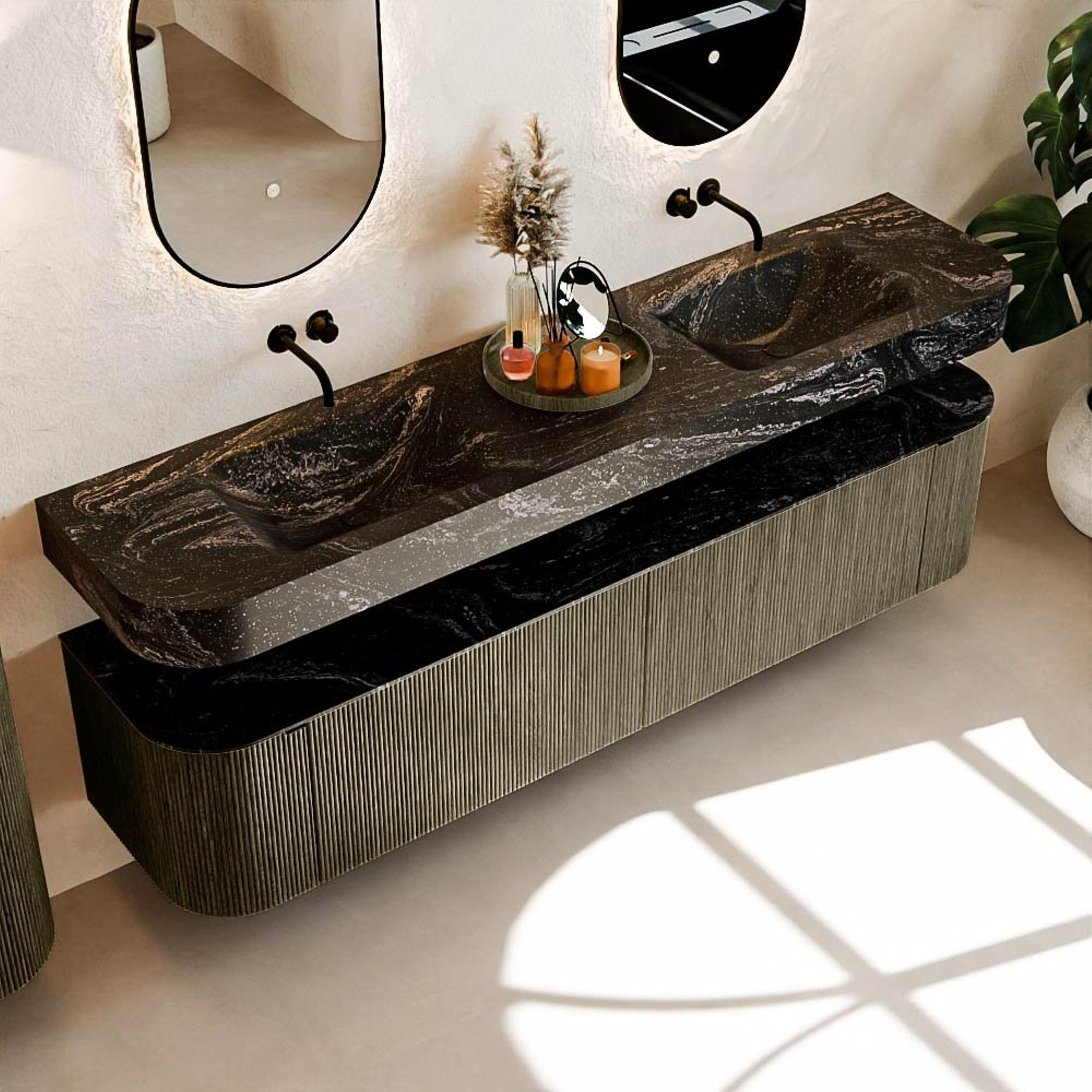 MONDIAZ THOR-DLUX 200cm badmeubel ronding links + rechts kleur Shadow met 2 lades en 2 deuren. Vrijhangende wastafel CLOUD Dubbel zonder kraangat kleur Lava.