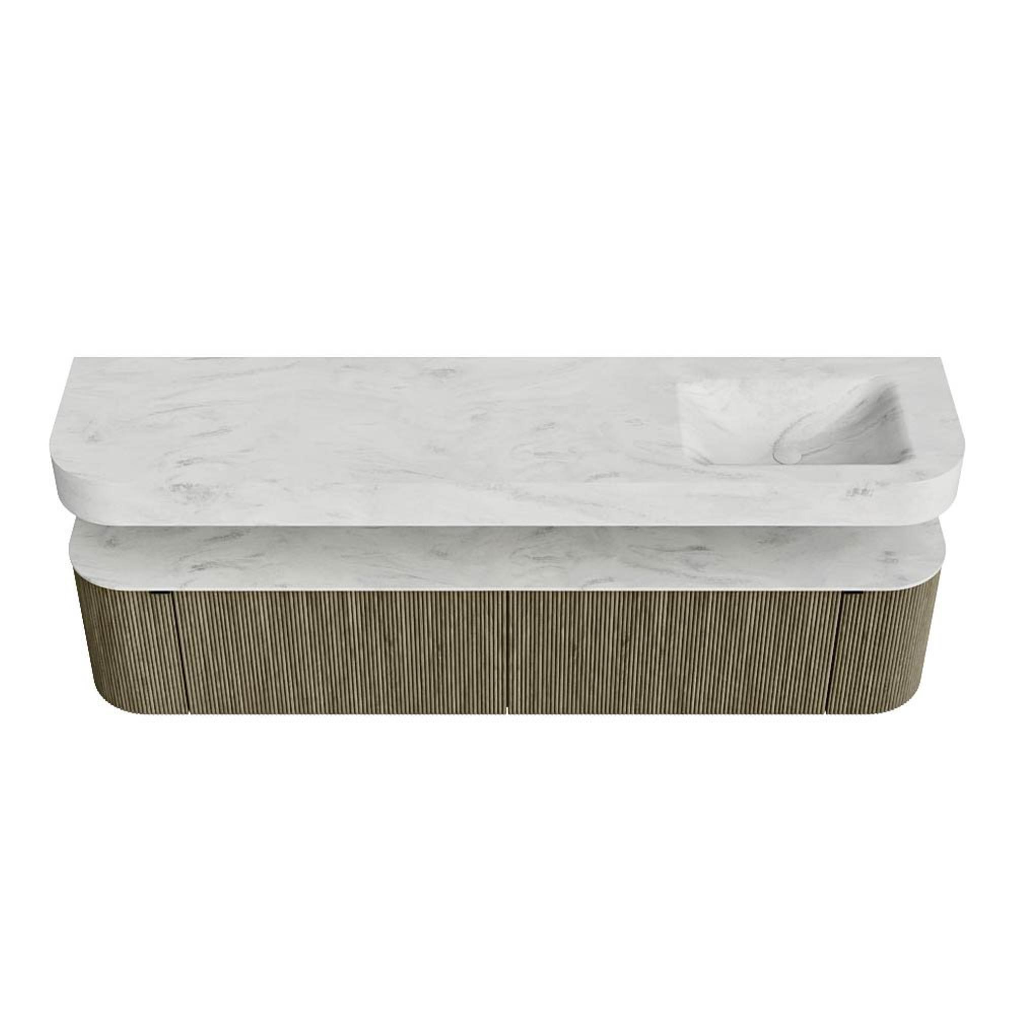 Boven het meubel zweeft een bijpassende, vrij hangende wastafel met afgeronde hoeken – perfect afgestemd op de vorm van de kast. De wastafel is uitgevoerd in Solid Surface en volgt subtiel de lijnen van het onderliggende meubel, waardoor een harmonieus geheel ontstaat. Het Solid Surface topblad vormt een sterke, onderhoudsvriendelijke basis en maakt de combinatie compleet.