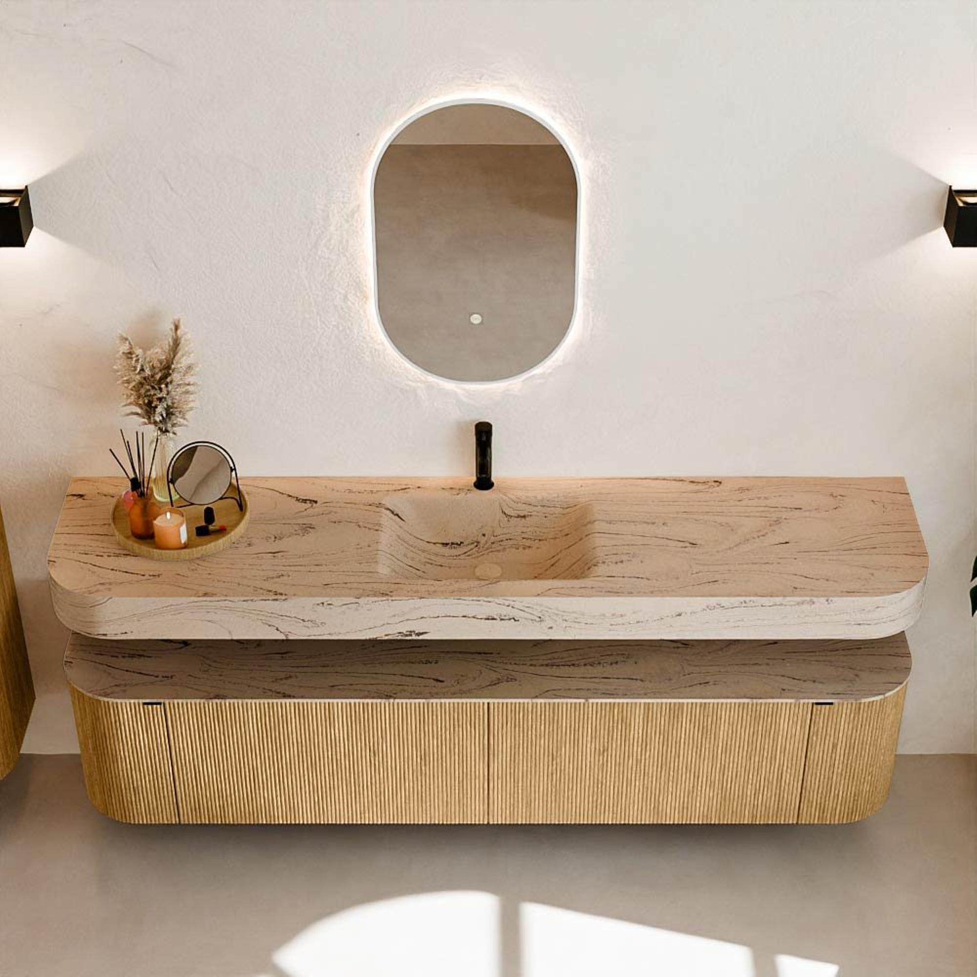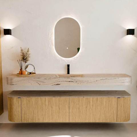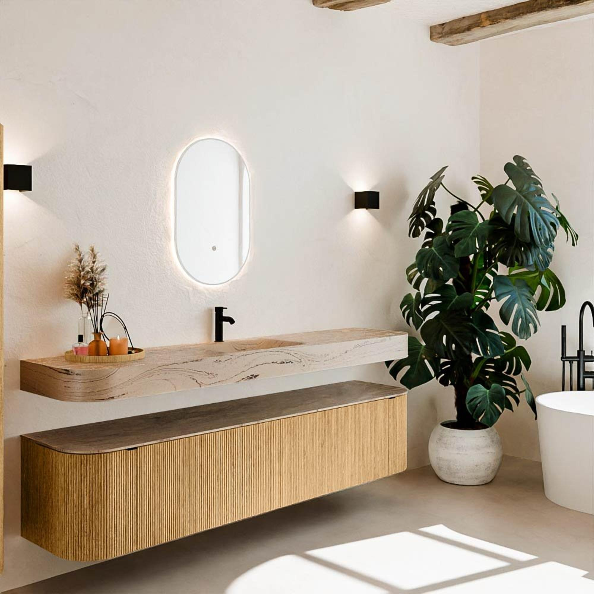Natuurlijke materialen in warme tinten. De verticale ribbels brengen ritme en textuur in het ontwerp, terwijl het eikenhout zorgt voor een warme, ambachtelijke uitstraling. Kies uit 5 houttinten OAK, WALNUT, DUSK, SHADOW en RUBY zorgvuldig geselecteerde houtkleuren om zowel moderne als klassieke badkamers te verrijken.