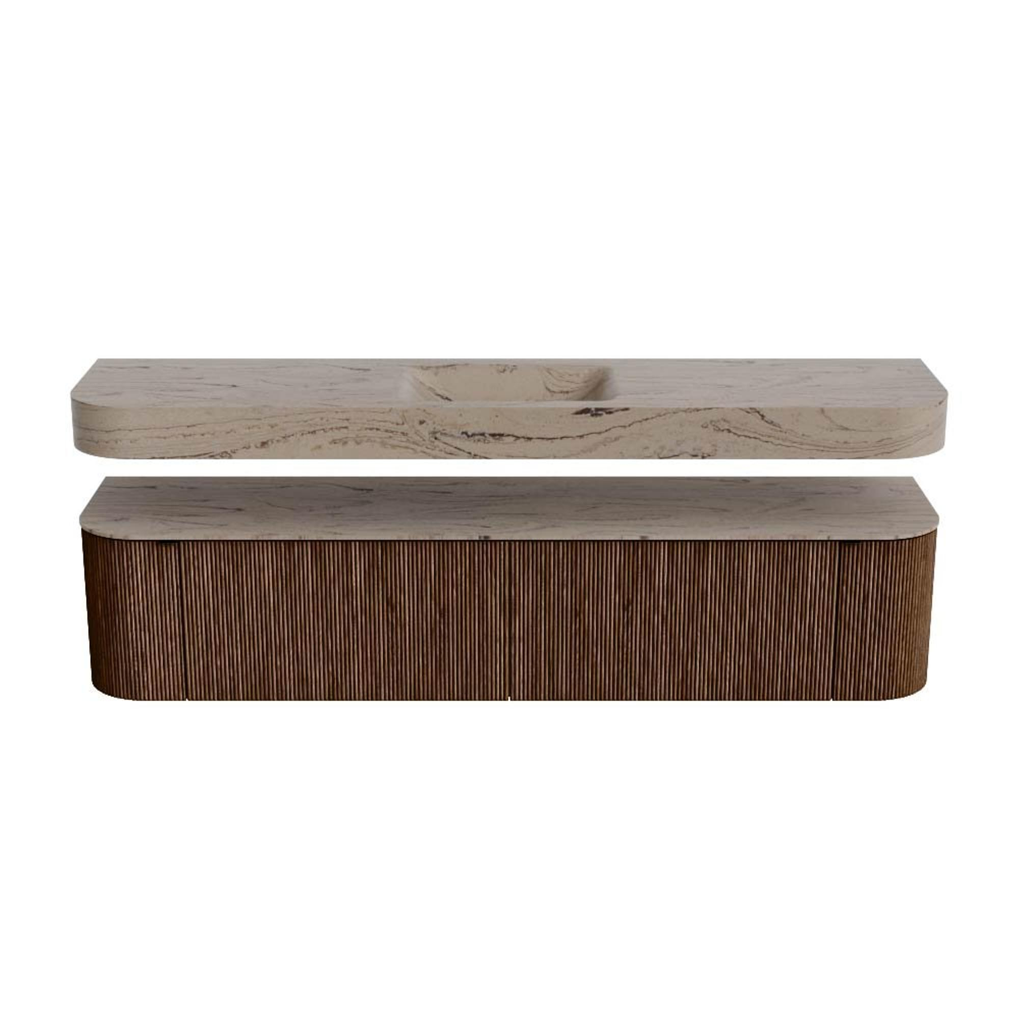 MONDIAZ THOR-DLUX 200cm badmeubel ronding links + rechts kleur Walnut met 2 lades en 2 deuren. Vrijhangende wastafel CLOUD Midden zonder kraangat kleur Arena.