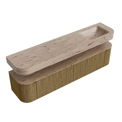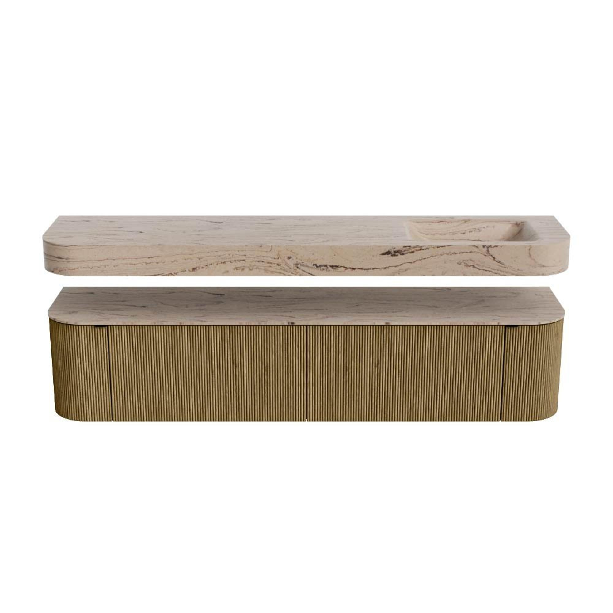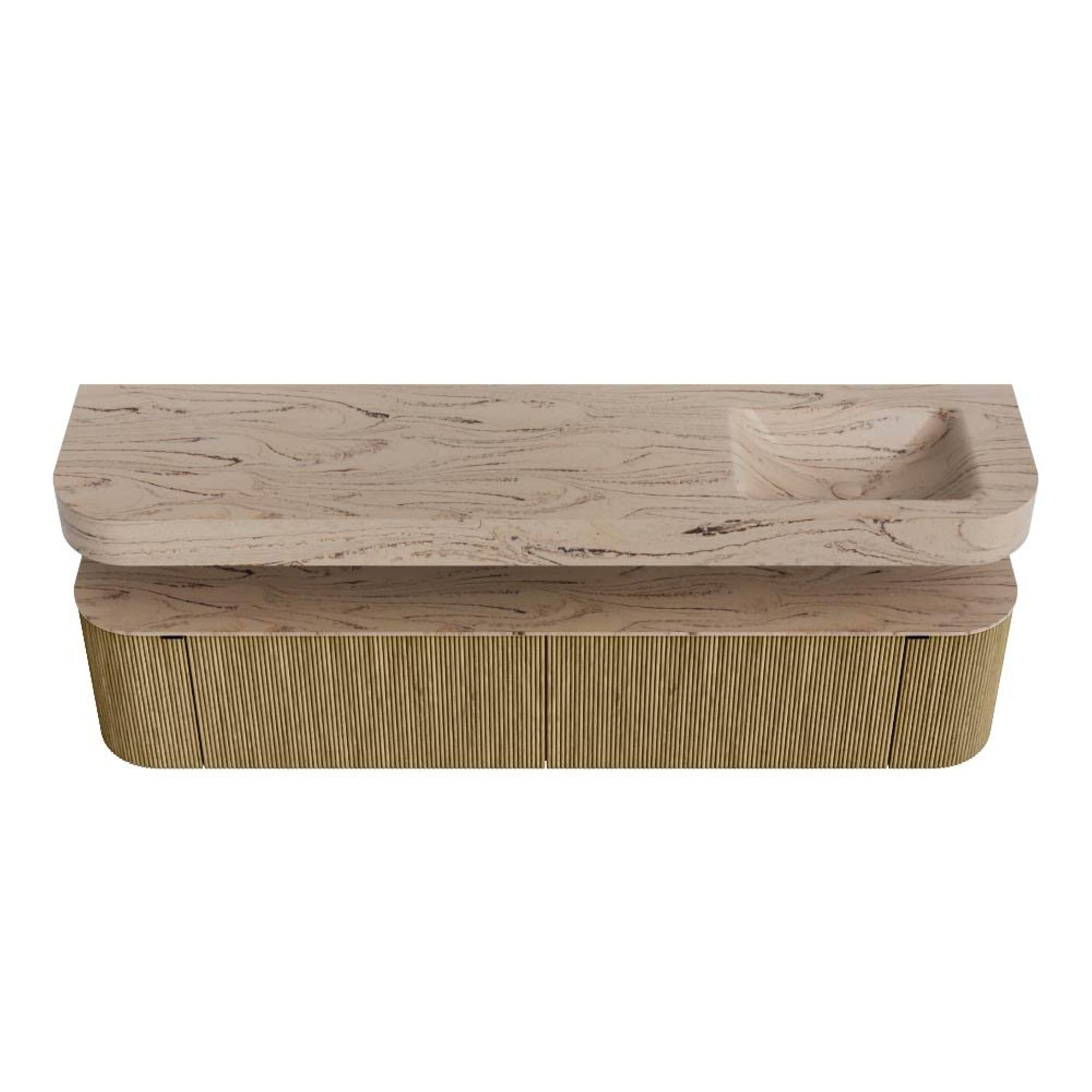 MONDIAZ THOR-DLUX 200cm badmeubel ronding links + rechts kleur Dusk met 2 lades en 2 deuren. Vrijhangende wastafel CLOUD Rechts zonder kraangat kleur Arena.