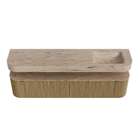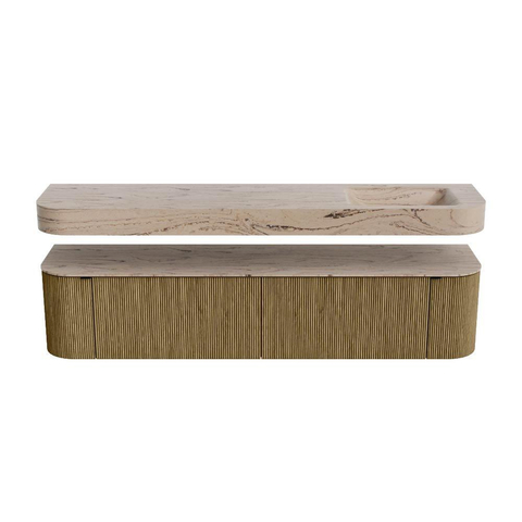 Boven het meubel zweeft een bijpassende, vrij hangende wastafel met afgeronde hoeken – perfect afgestemd op de vorm van de kast. De wastafel is uitgevoerd in Solid Surface en volgt subtiel de lijnen van het onderliggende meubel, waardoor een harmonieus geheel ontstaat. Het Solid Surface topblad vormt een sterke, onderhoudsvriendelijke basis en maakt de combinatie compleet.