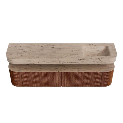 Boven het meubel zweeft een bijpassende, vrij hangende wastafel met afgeronde hoeken – perfect afgestemd op de vorm van de kast. De wastafel is uitgevoerd in Solid Surface en volgt subtiel de lijnen van het onderliggende meubel, waardoor een harmonieus geheel ontstaat. Het Solid Surface topblad vormt een sterke, onderhoudsvriendelijke basis en maakt de combinatie compleet.