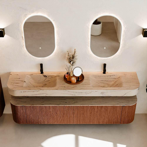 Natuurlijke materialen in warme tinten. De verticale ribbels brengen ritme en textuur in het ontwerp, terwijl het eikenhout zorgt voor een warme, ambachtelijke uitstraling. Kies uit 5 houttinten OAK, WALNUT, DUSK, SHADOW en RUBY zorgvuldig geselecteerde houtkleuren om zowel moderne als klassieke badkamers te verrijken.