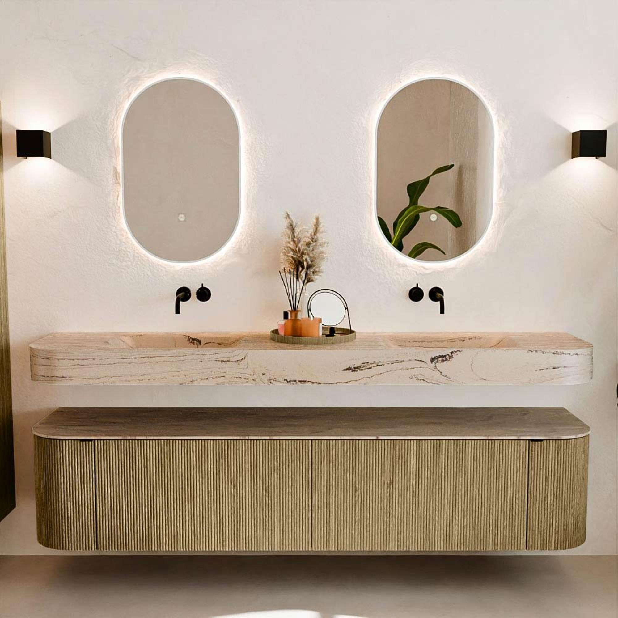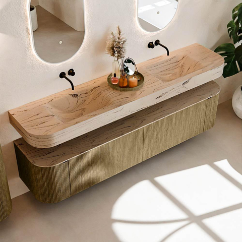Natuurlijke materialen in warme tinten. De verticale ribbels brengen ritme en textuur in het ontwerp, terwijl het eikenhout zorgt voor een warme, ambachtelijke uitstraling. Kies uit 5 houttinten OAK, WALNUT, DUSK, SHADOW en RUBY zorgvuldig geselecteerde houtkleuren om zowel moderne als klassieke badkamers te verrijken.