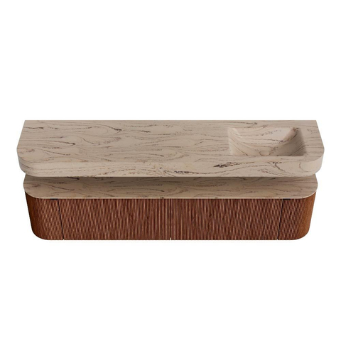 Natuurlijke materialen in warme tinten. De verticale ribbels brengen ritme en textuur in het ontwerp, terwijl het eikenhout zorgt voor een warme, ambachtelijke uitstraling. Kies uit 5 houttinten OAK, WALNUT, DUSK, SHADOW en RUBY zorgvuldig geselecteerde houtkleuren om zowel moderne als klassieke badkamers te verrijken.
