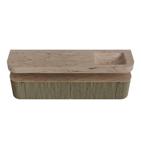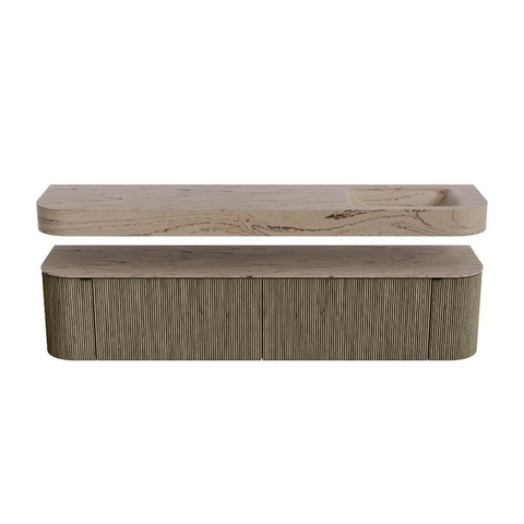 Boven het meubel zweeft een bijpassende, vrij hangende wastafel met afgeronde hoeken – perfect afgestemd op de vorm van de kast. De wastafel is uitgevoerd in Solid Surface en volgt subtiel de lijnen van het onderliggende meubel, waardoor een harmonieus geheel ontstaat. Het Solid Surface topblad vormt een sterke, onderhoudsvriendelijke basis en maakt de combinatie compleet.