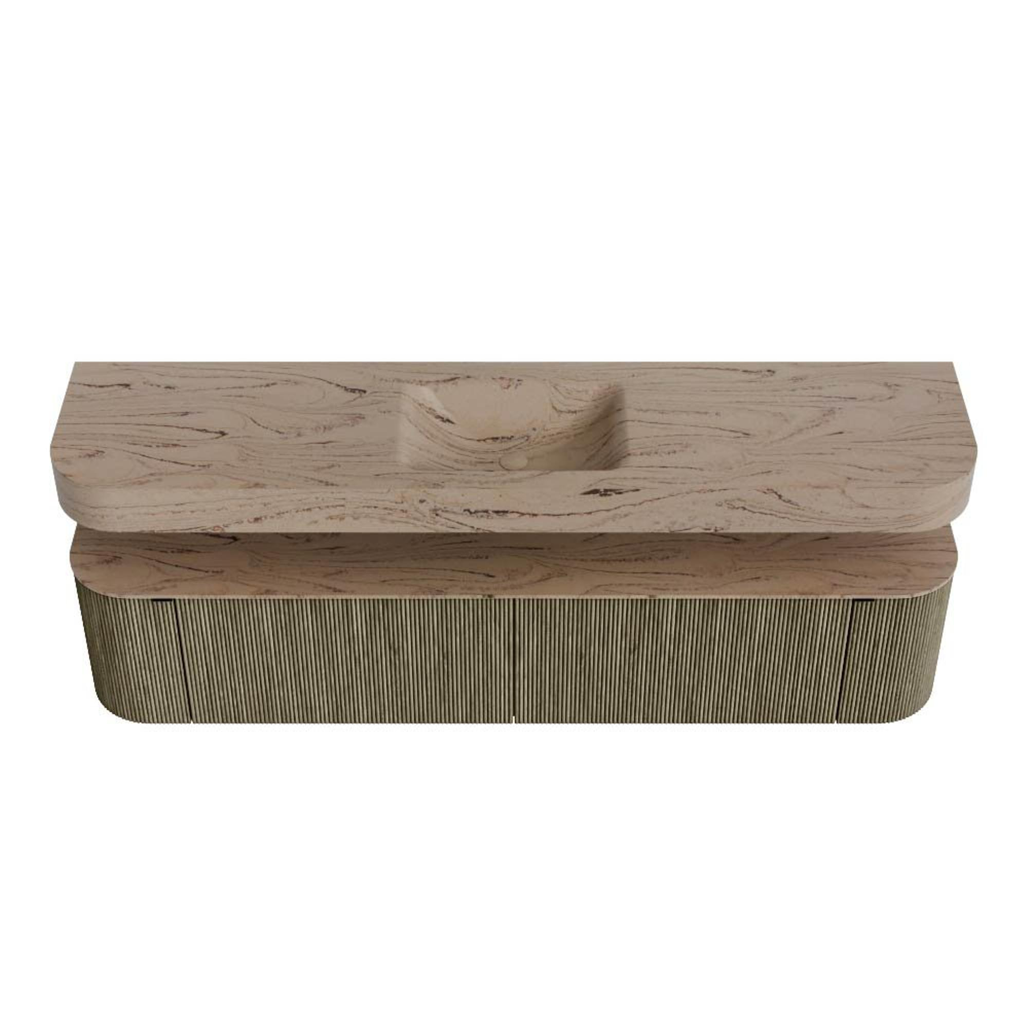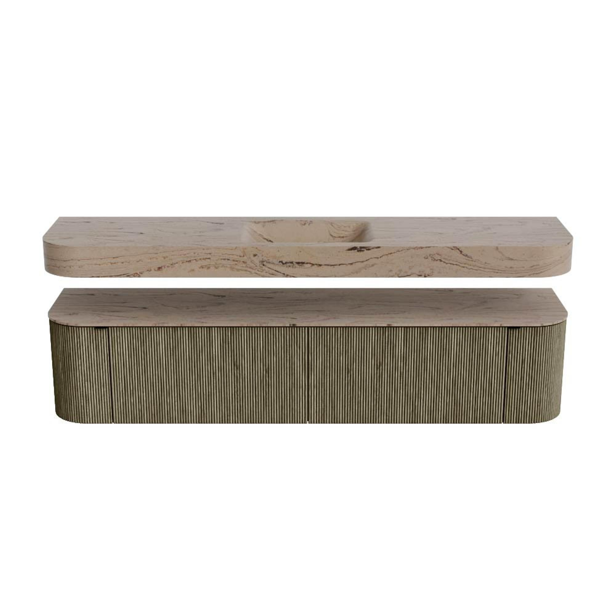Boven het meubel zweeft een bijpassende, vrij hangende wastafel met afgeronde hoeken – perfect afgestemd op de vorm van de kast. De wastafel is uitgevoerd in Solid Surface en volgt subtiel de lijnen van het onderliggende meubel, waardoor een harmonieus geheel ontstaat. Het Solid Surface topblad vormt een sterke, onderhoudsvriendelijke basis en maakt de combinatie compleet.