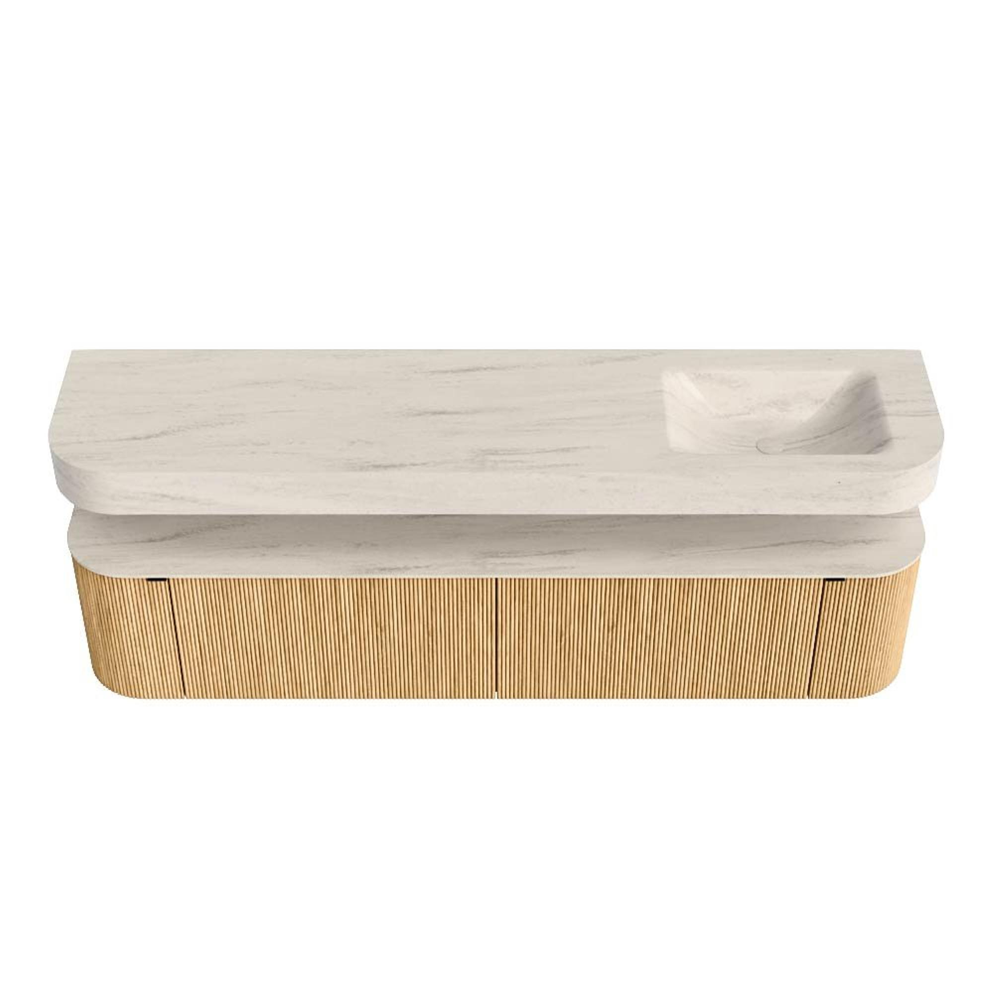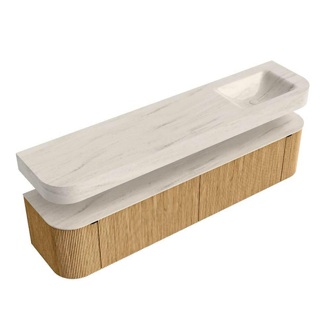 MONDIAZ THOR-DLUX 200cm badmeubel ronding links + rechts kleur Oak met 2 lades en 2 deuren. Vrijhangende wastafel CLOUD Rechts 1 kraangat kleur Meli.
