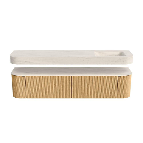 Boven het meubel zweeft een bijpassende, vrij hangende wastafel met afgeronde hoeken – perfect afgestemd op de vorm van de kast. De wastafel is uitgevoerd in Solid Surface en volgt subtiel de lijnen van het onderliggende meubel, waardoor een harmonieus geheel ontstaat. Het Solid Surface topblad vormt een sterke, onderhoudsvriendelijke basis en maakt de combinatie compleet.