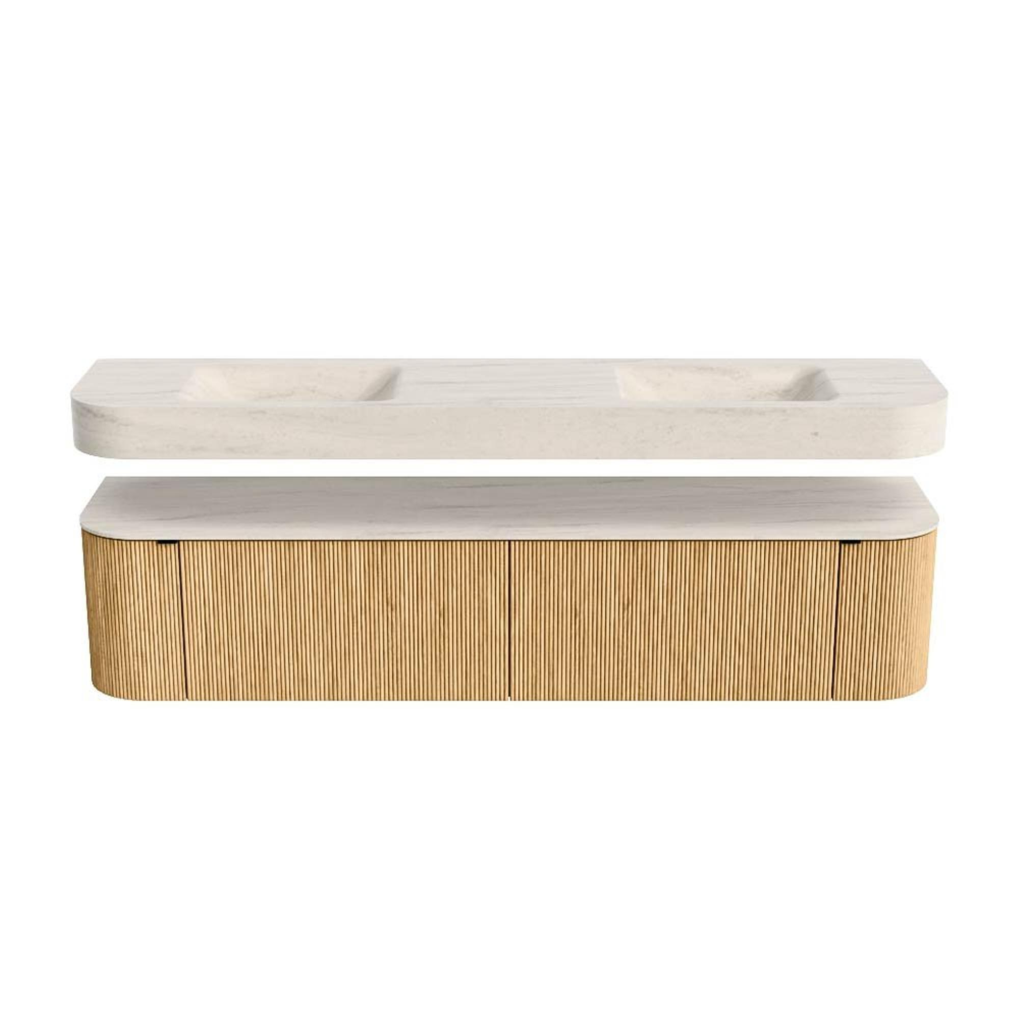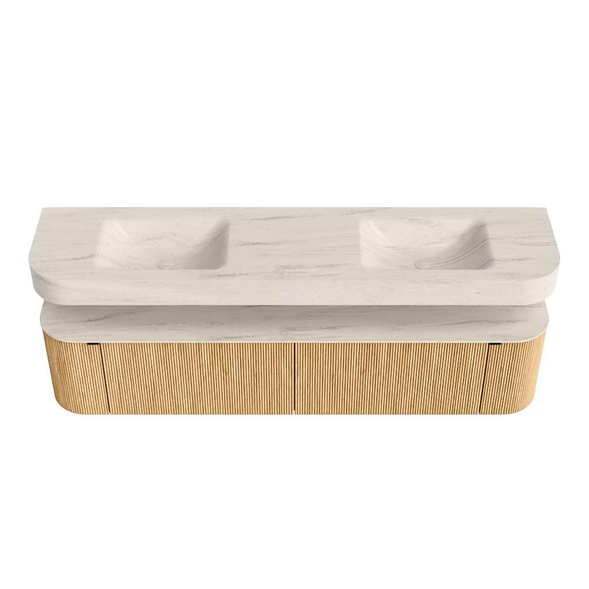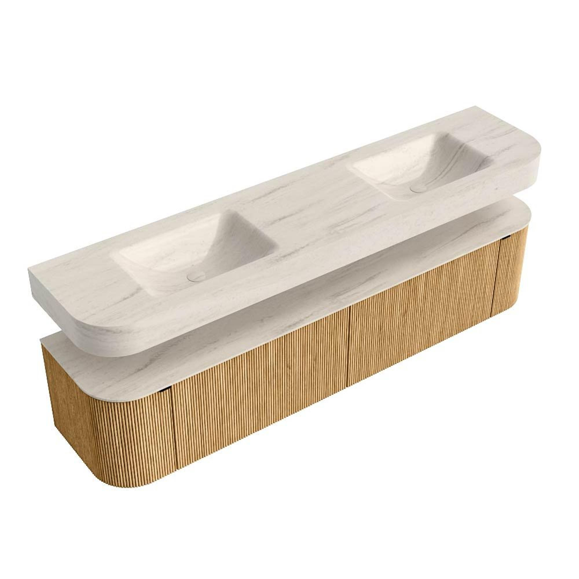 MONDIAZ THOR-DLUX 200cm badmeubel ronding links + rechts kleur Oak met 2 lades en 2 deuren. Vrijhangende wastafel CLOUD Dubbel 2 kraangaten kleur Meli.