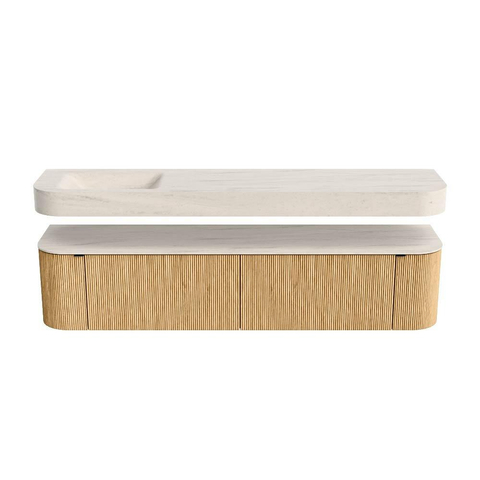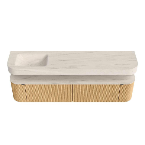 MONDIAZ THOR-DLUX 200cm badmeubel ronding links + rechts kleur Oak met 2 lades en 2 deuren. Vrijhangende wastafel CLOUD Links zonder kraangat kleur Meli.
