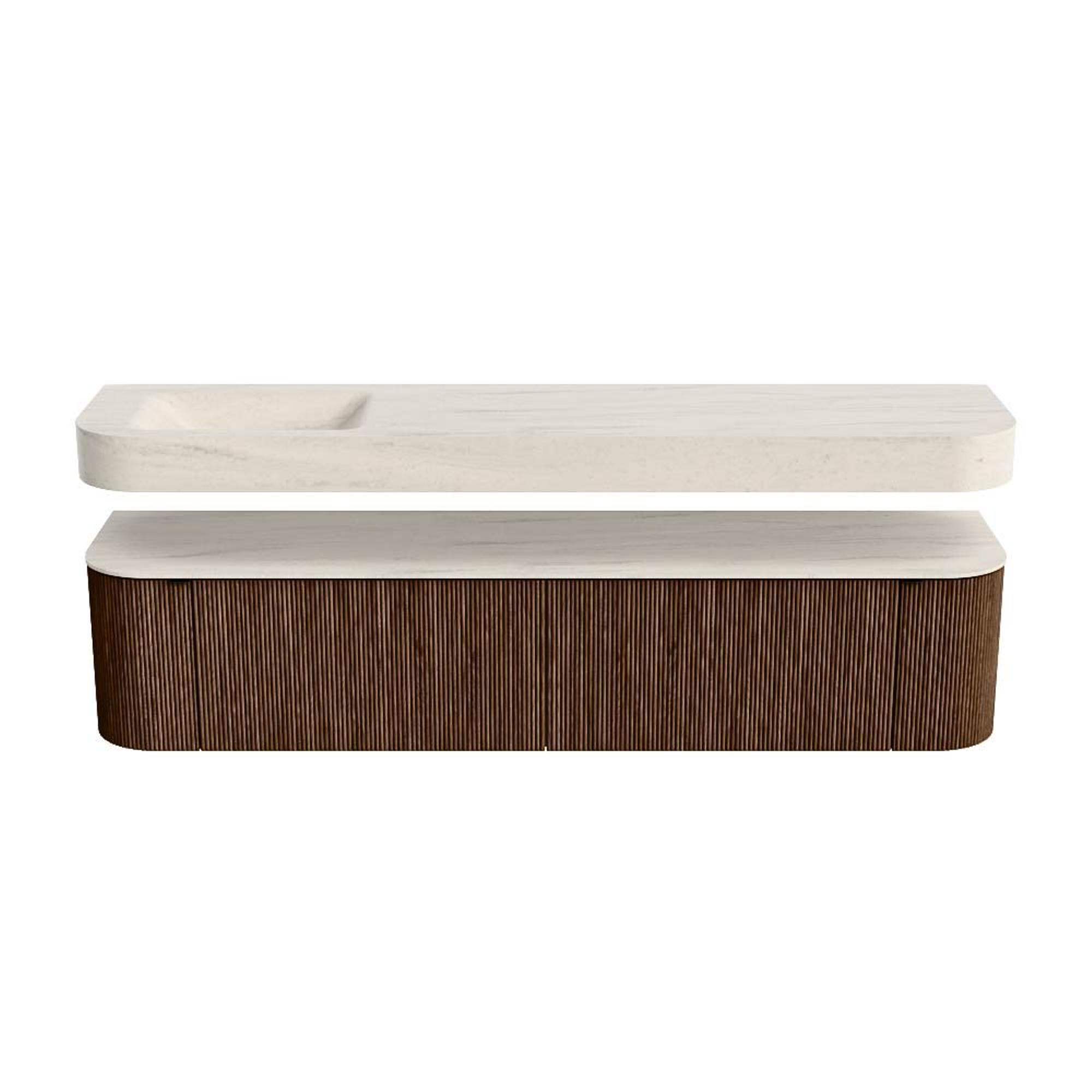 MONDIAZ THOR-DLUX 200cm badmeubel ronding links + rechts kleur Walnut met 2 lades en 2 deuren. Vrijhangende wastafel CLOUD Links zonder kraangat kleur Meli.
