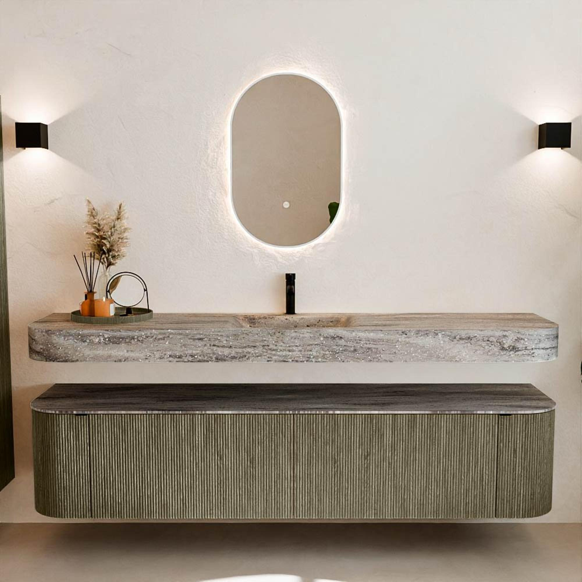 Natuurlijke materialen in warme tinten. De verticale ribbels brengen ritme en textuur in het ontwerp, terwijl het eikenhout zorgt voor een warme, ambachtelijke uitstraling. Kies uit 5 houttinten OAK, WALNUT, DUSK, SHADOW en RUBY zorgvuldig geselecteerde houtkleuren om zowel moderne als klassieke badkamers te verrijken.