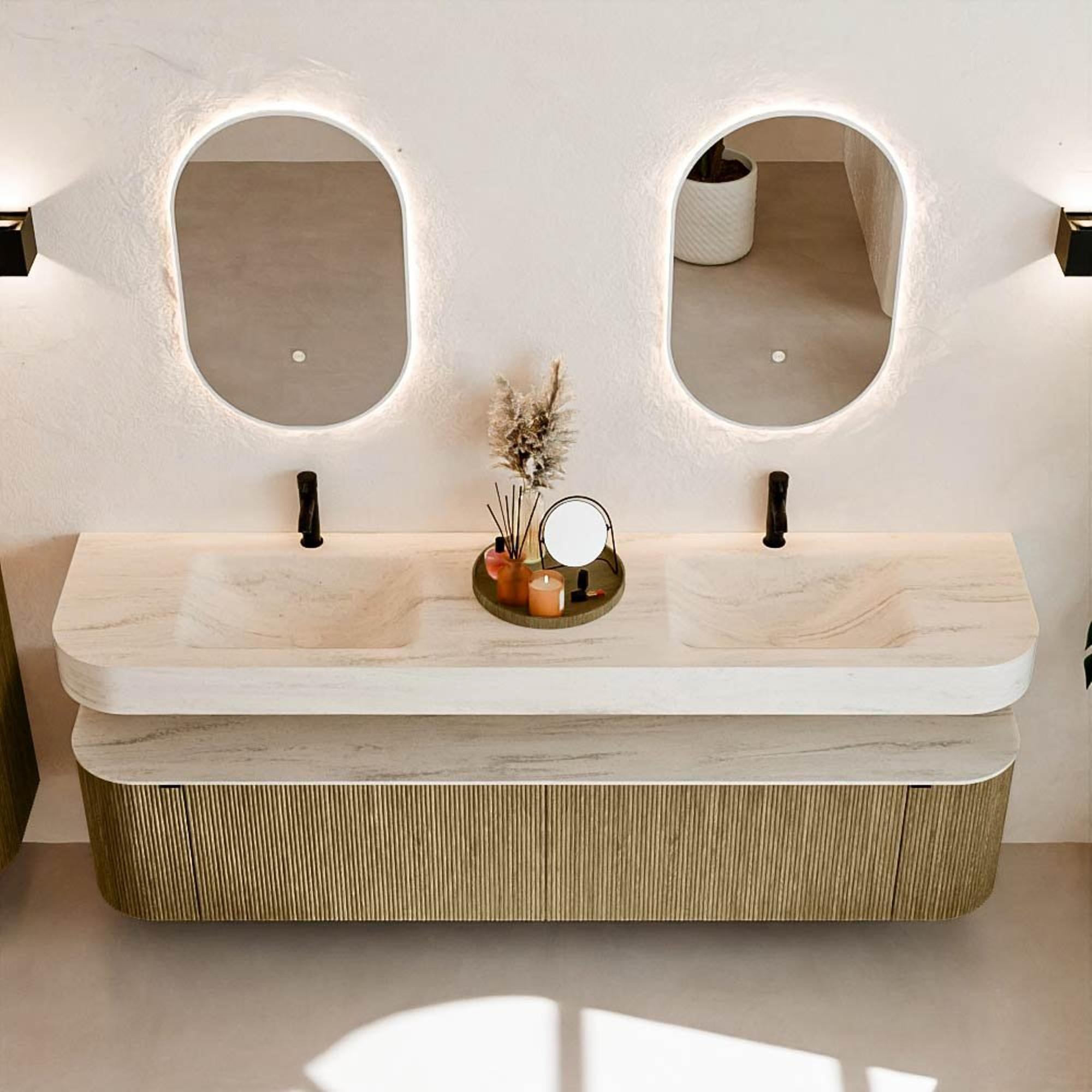 Natuurlijke materialen in warme tinten. De verticale ribbels brengen ritme en textuur in het ontwerp, terwijl het eikenhout zorgt voor een warme, ambachtelijke uitstraling. Kies uit 5 houttinten OAK, WALNUT, DUSK, SHADOW en RUBY zorgvuldig geselecteerde houtkleuren om zowel moderne als klassieke badkamers te verrijken.