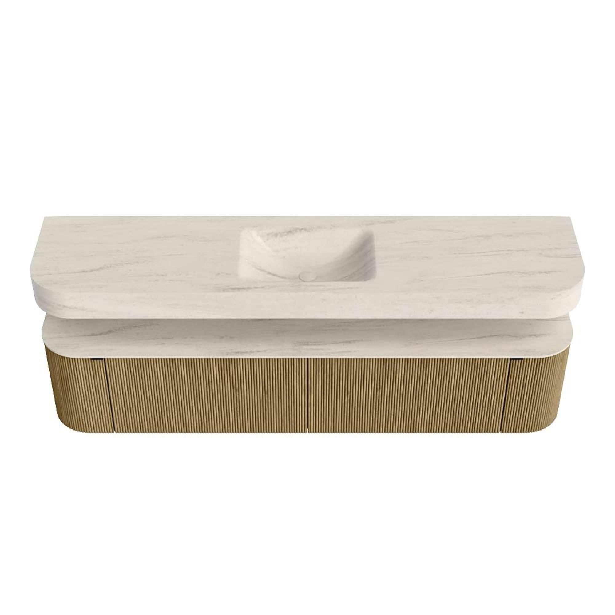 Boven het meubel zweeft een bijpassende, vrij hangende wastafel met afgeronde hoeken – perfect afgestemd op de vorm van de kast. De wastafel is uitgevoerd in Solid Surface en volgt subtiel de lijnen van het onderliggende meubel, waardoor een harmonieus geheel ontstaat. Het Solid Surface topblad vormt een sterke, onderhoudsvriendelijke basis en maakt de combinatie compleet.