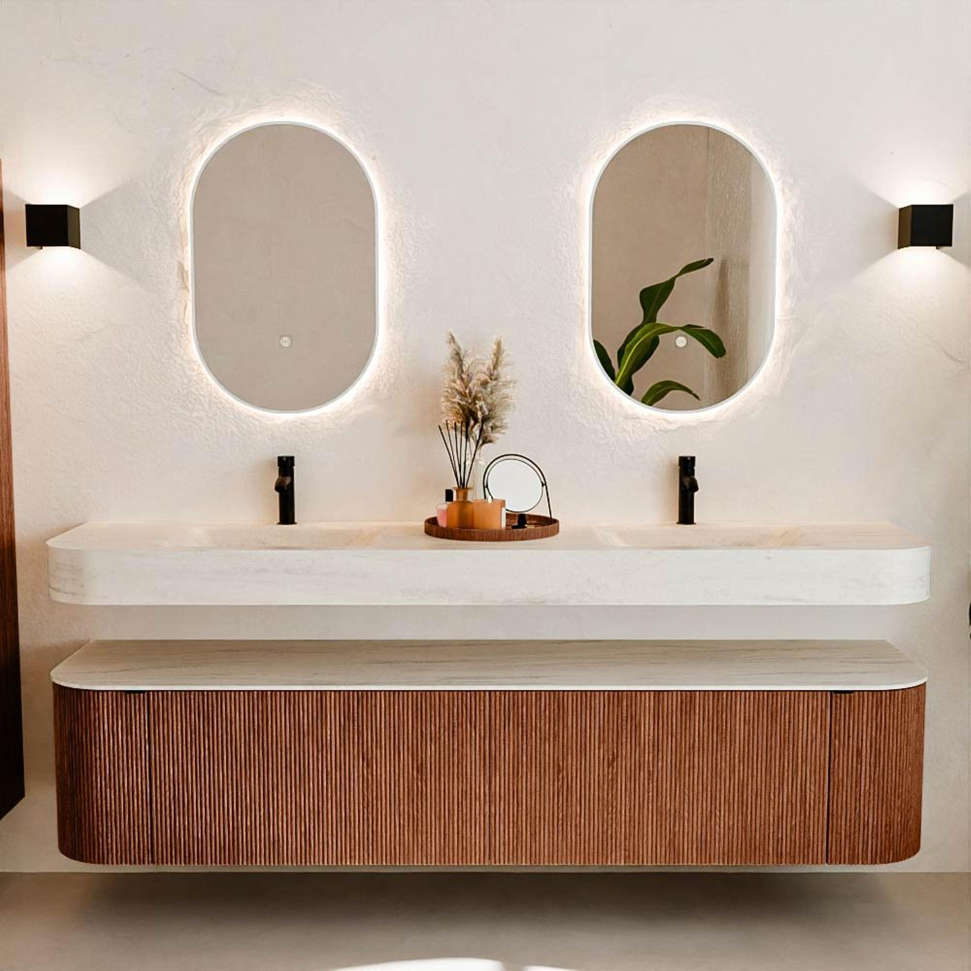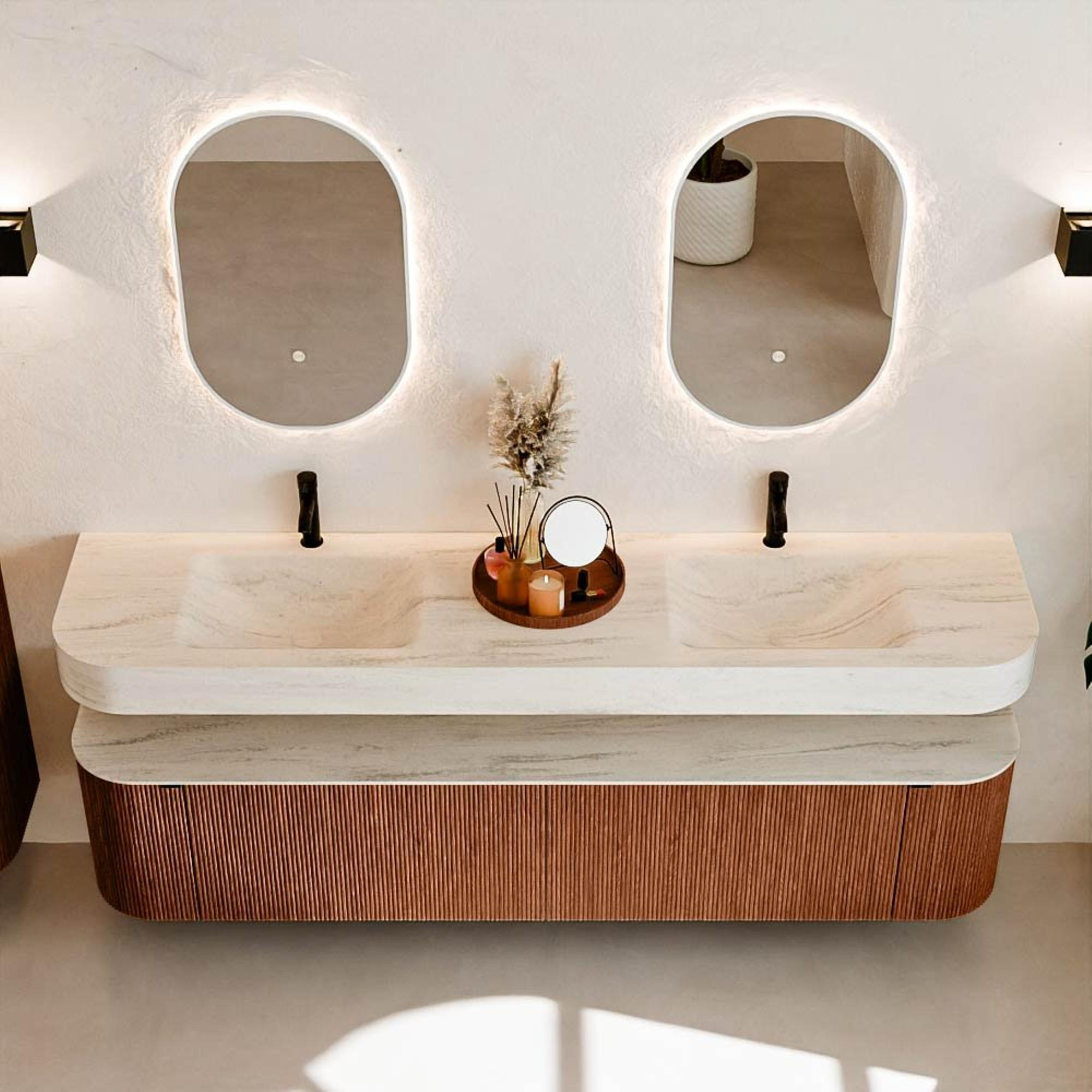 Natuurlijke materialen in warme tinten. De verticale ribbels brengen ritme en textuur in het ontwerp, terwijl het eikenhout zorgt voor een warme, ambachtelijke uitstraling. Kies uit 5 houttinten OAK, WALNUT, DUSK, SHADOW en RUBY zorgvuldig geselecteerde houtkleuren om zowel moderne als klassieke badkamers te verrijken.