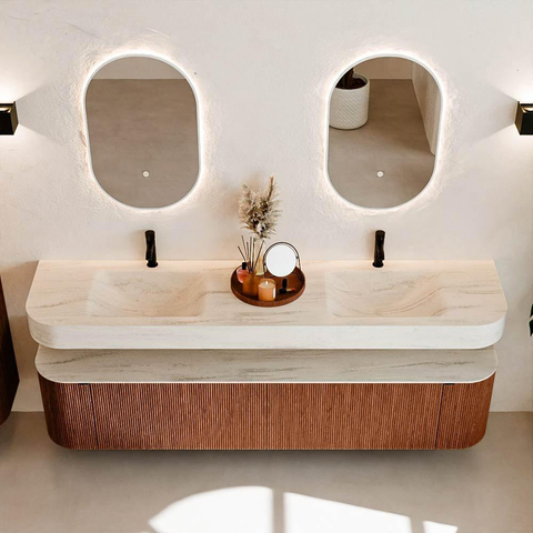 MONDIAZ THOR-DLUX 200cm badmeubel ronding links + rechts kleur Ruby met 2 lades en 2 deuren. Vrijhangende wastafel CLOUD Dubbel 2 kraangaten kleur Meli.