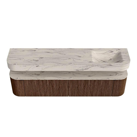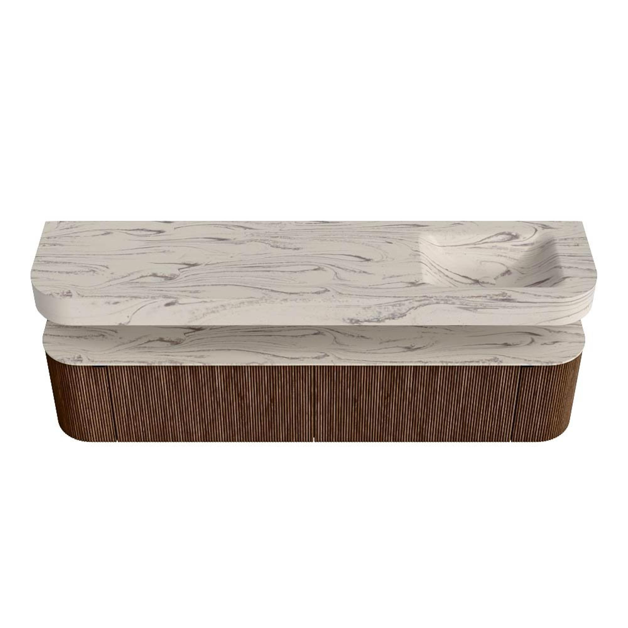 MONDIAZ THOR-DLUX 200cm badmeubel ronding links + rechts kleur Walnut met 2 lades en 2 deuren. Vrijhangende wastafel CLOUD Rechts 1 kraangat kleur Nata.