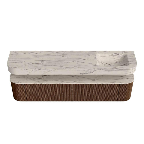 MONDIAZ THOR-DLUX 200cm badmeubel ronding links + rechts kleur Walnut met 2 lades en 2 deuren. Vrijhangende wastafel CLOUD Rechts zonder kraangat kleur Nata.
