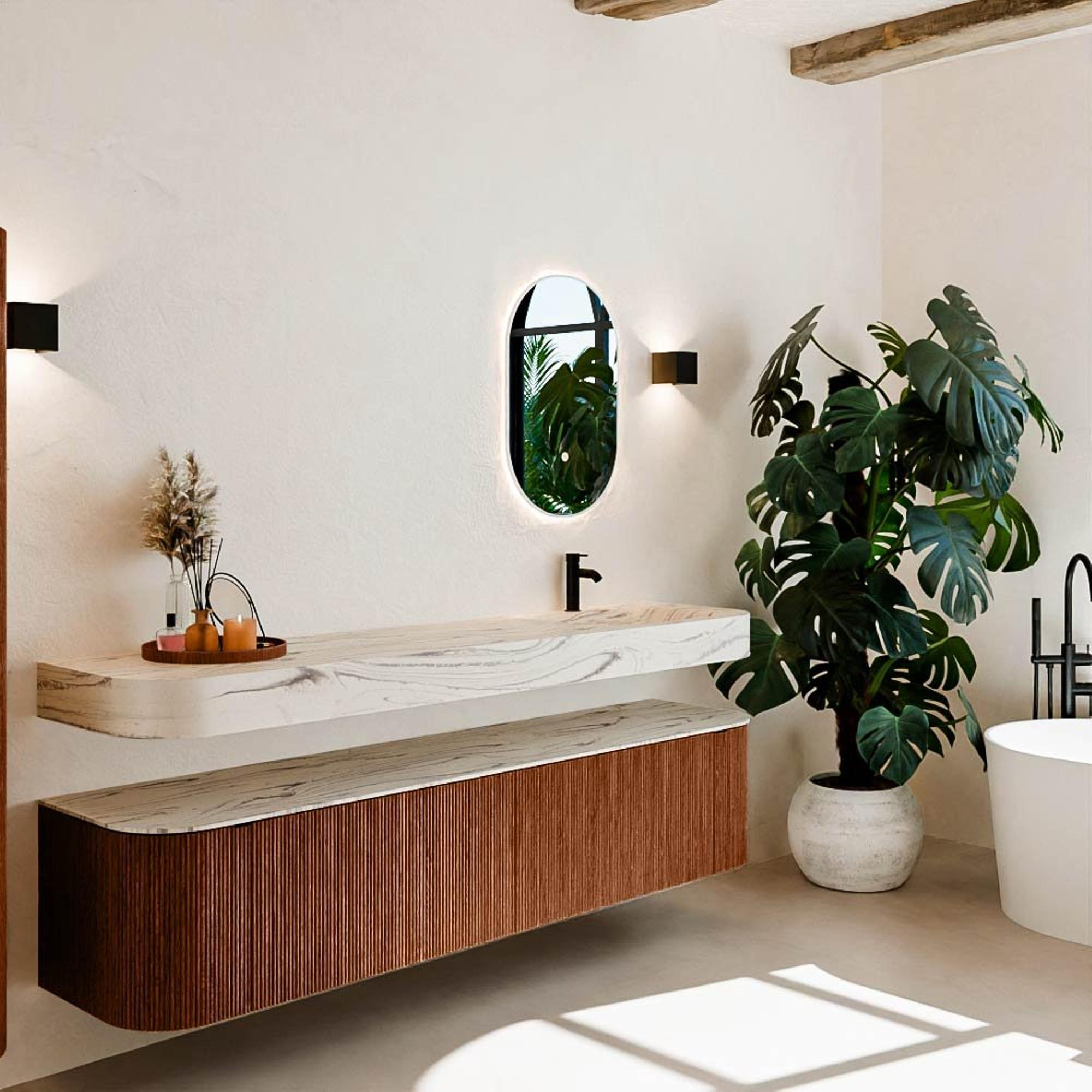 Natuurlijke materialen in warme tinten. De verticale ribbels brengen ritme en textuur in het ontwerp, terwijl het eikenhout zorgt voor een warme, ambachtelijke uitstraling. Kies uit 5 houttinten OAK, WALNUT, DUSK, SHADOW en RUBY zorgvuldig geselecteerde houtkleuren om zowel moderne als klassieke badkamers te verrijken.