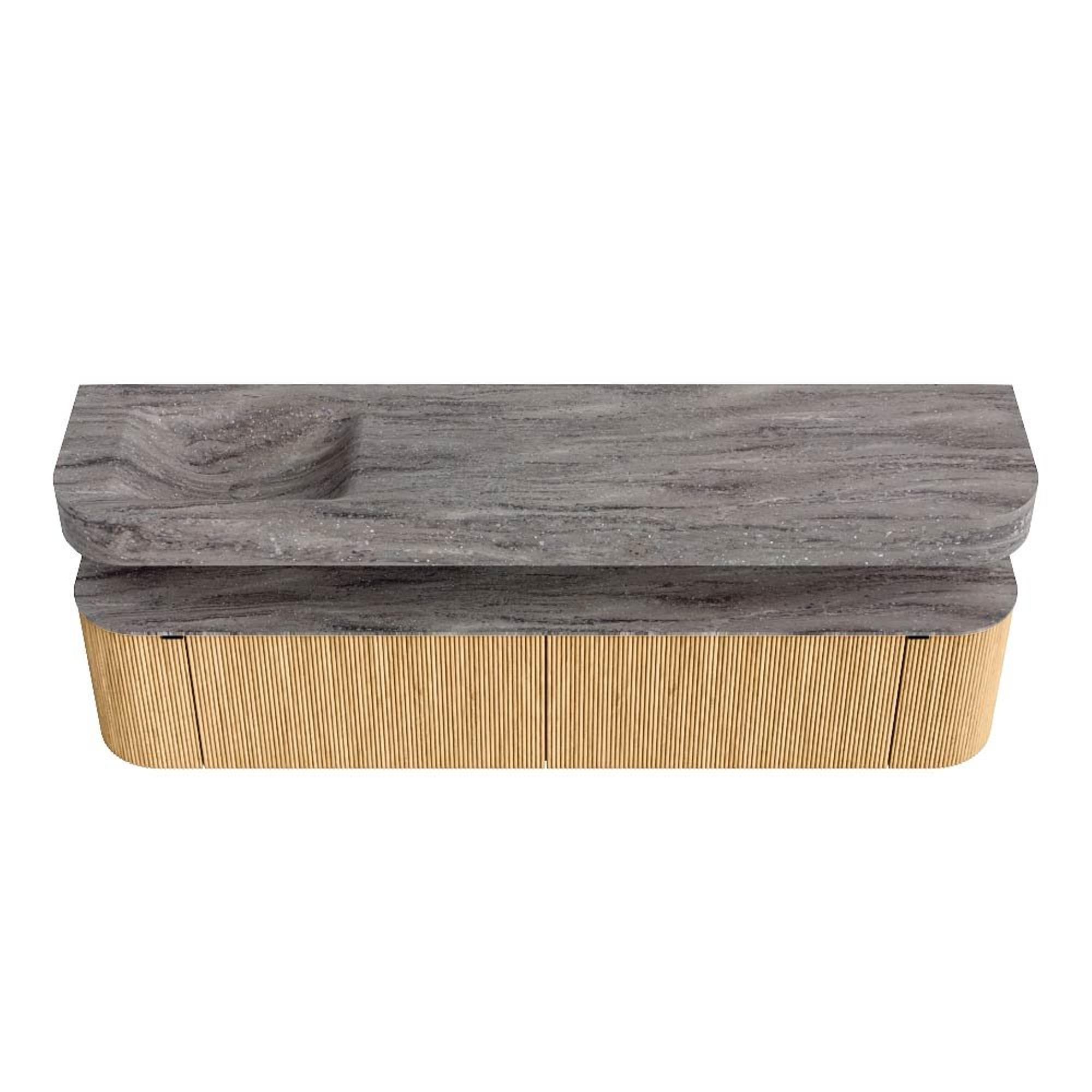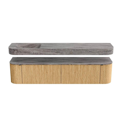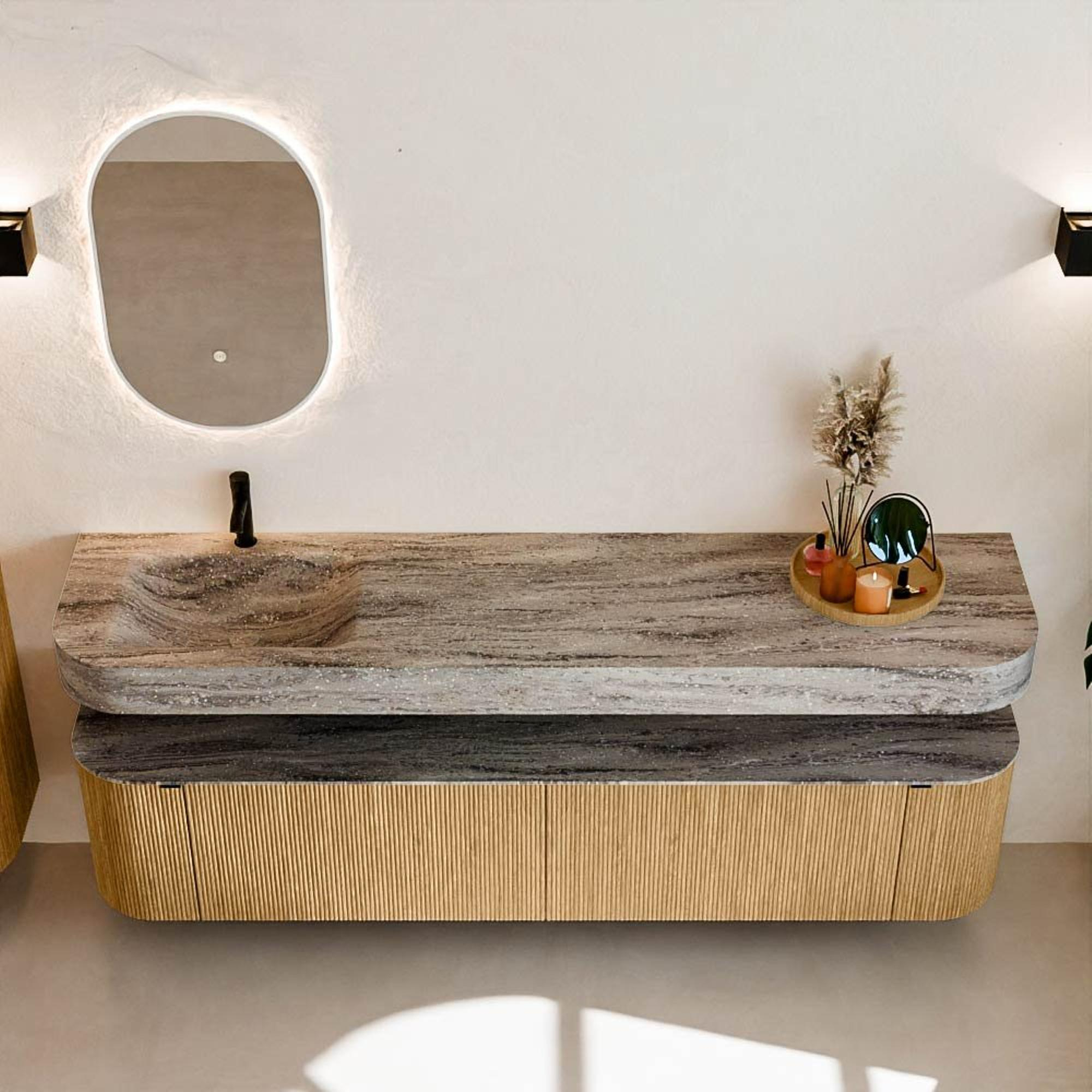 MONDIAZ THOR-DLUX 200cm badmeubel ronding links + rechts kleur Oak met 2 lades en 2 deuren. Vrijhangende wastafel CLOUD Links 1 kraangat kleur Oza.