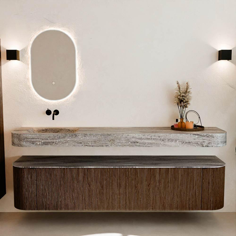 MONDIAZ THOR-DLUX 200cm badmeubel ronding links + rechts kleur Walnut met 2 lades en 2 deuren. Vrijhangende wastafel CLOUD Links zonder kraangat kleur Oza.