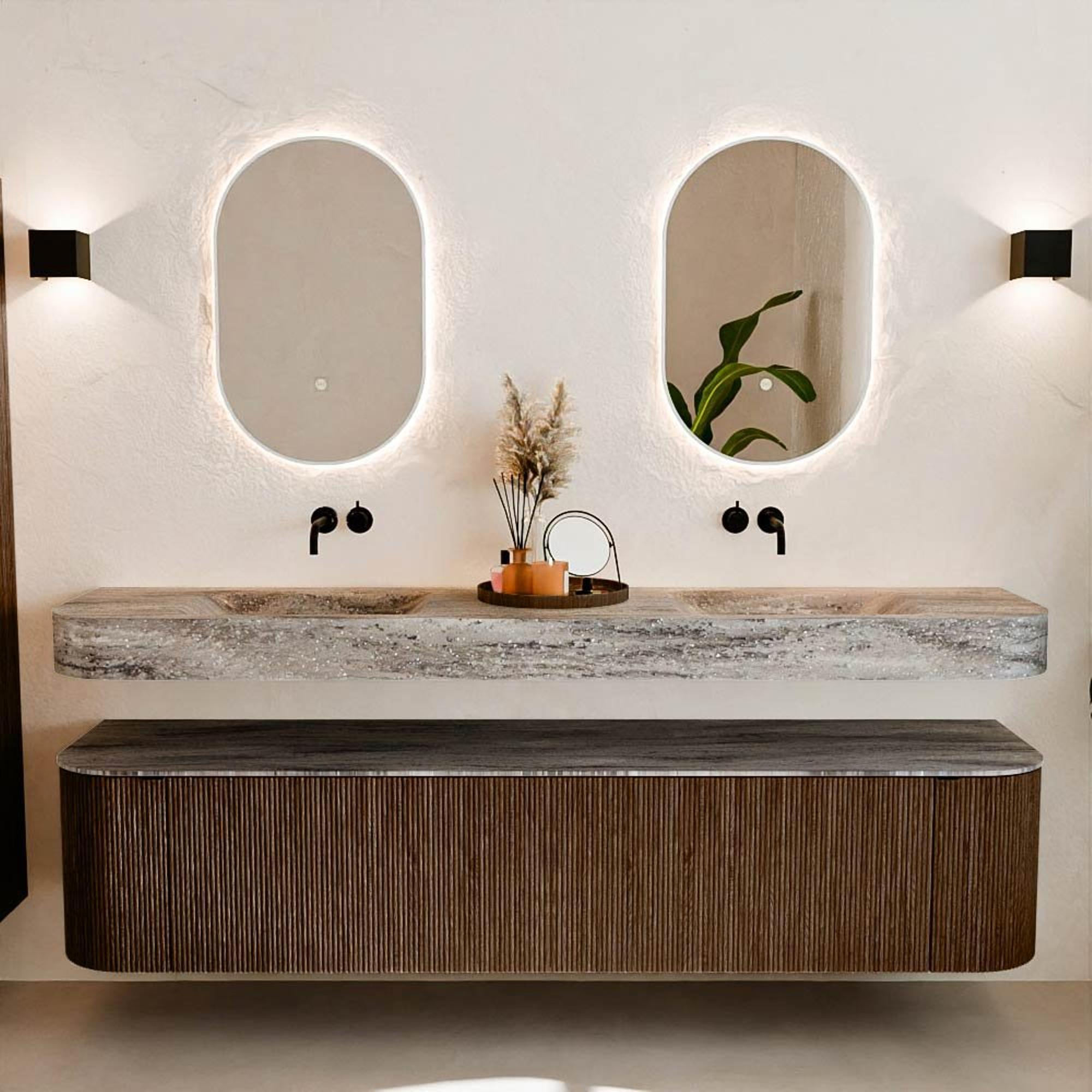 Natuurlijke materialen in warme tinten. De verticale ribbels brengen ritme en textuur in het ontwerp, terwijl het eikenhout zorgt voor een warme, ambachtelijke uitstraling. Kies uit 5 houttinten OAK, WALNUT, DUSK, SHADOW en RUBY zorgvuldig geselecteerde houtkleuren om zowel moderne als klassieke badkamers te verrijken.