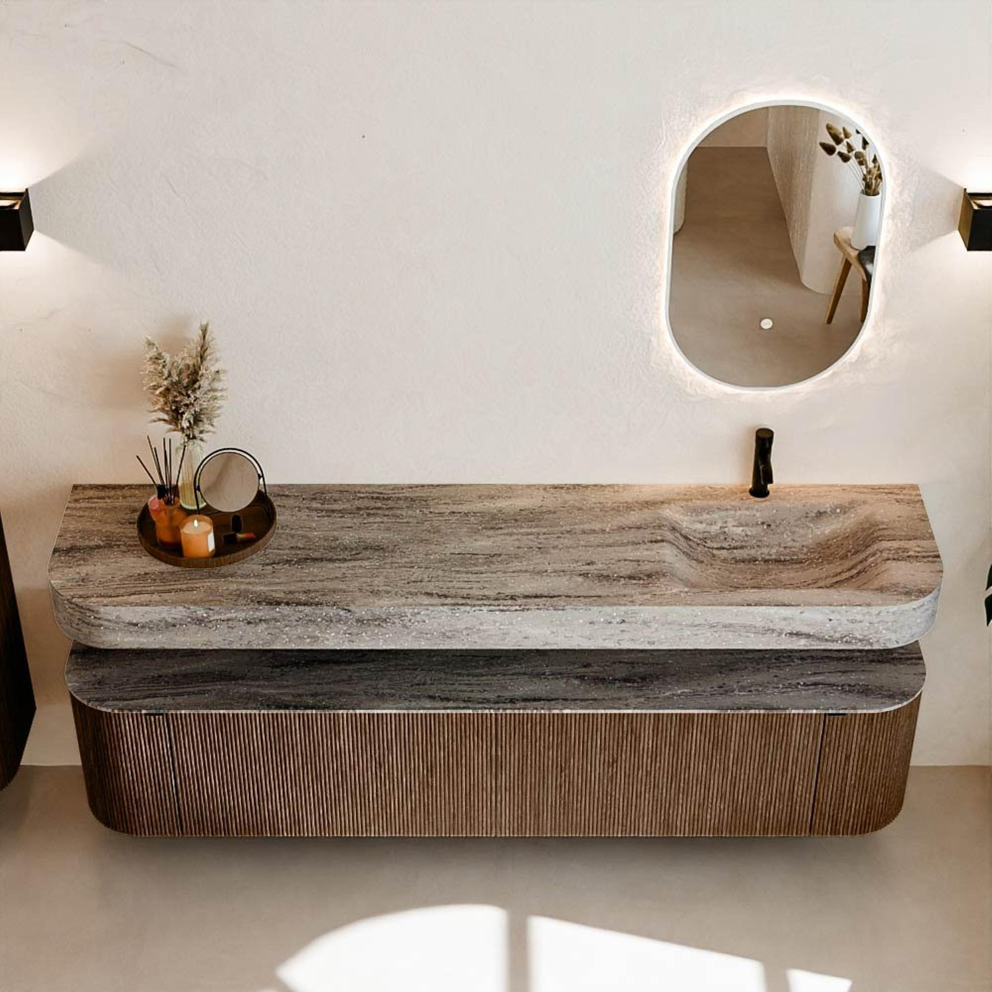 MONDIAZ THOR-DLUX 200cm badmeubel ronding links + rechts kleur Walnut met 2 lades en 2 deuren. Vrijhangende wastafel CLOUD Rechts 1 kraangat kleur Oza.