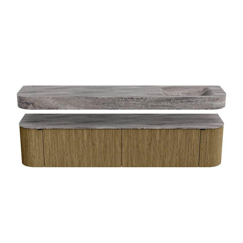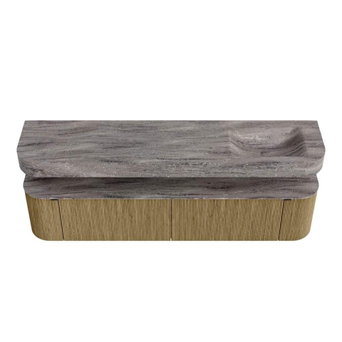 Boven het meubel zweeft een bijpassende, vrij hangende wastafel met afgeronde hoeken – perfect afgestemd op de vorm van de kast. De wastafel is uitgevoerd in Solid Surface en volgt subtiel de lijnen van het onderliggende meubel, waardoor een harmonieus geheel ontstaat. Het Solid Surface topblad vormt een sterke, onderhoudsvriendelijke basis en maakt de combinatie compleet.