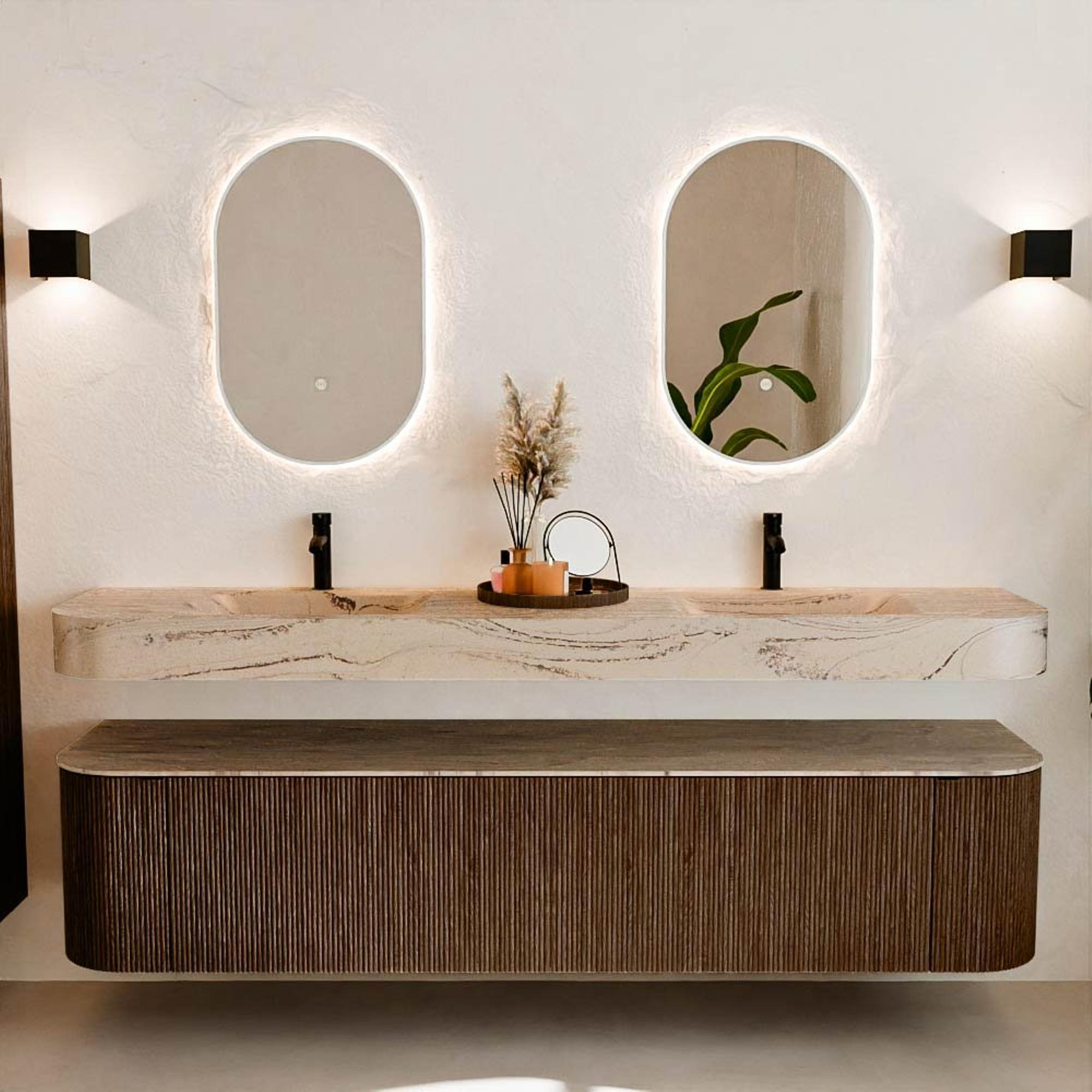 Natuurlijke materialen in warme tinten. De verticale ribbels brengen ritme en textuur in het ontwerp, terwijl het eikenhout zorgt voor een warme, ambachtelijke uitstraling. Kies uit 5 houttinten OAK, WALNUT, DUSK, SHADOW en RUBY zorgvuldig geselecteerde houtkleuren om zowel moderne als klassieke badkamers te verrijken.