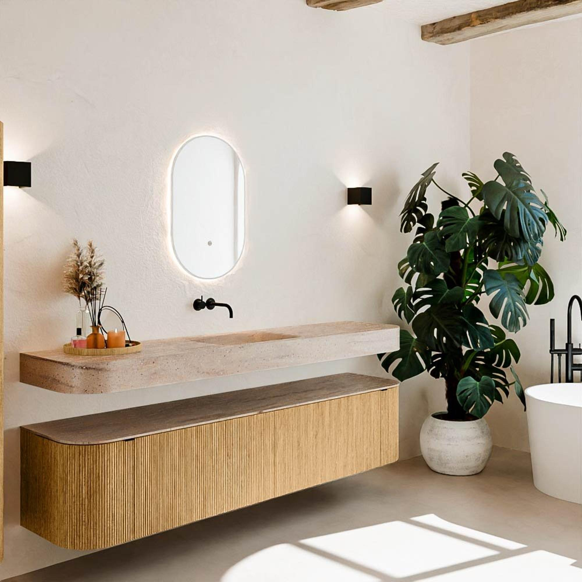 Natuurlijke materialen in warme tinten. De verticale ribbels brengen ritme en textuur in het ontwerp, terwijl het eikenhout zorgt voor een warme, ambachtelijke uitstraling. Kies uit 5 houttinten OAK, WALNUT, DUSK, SHADOW en RUBY zorgvuldig geselecteerde houtkleuren om zowel moderne als klassieke badkamers te verrijken.