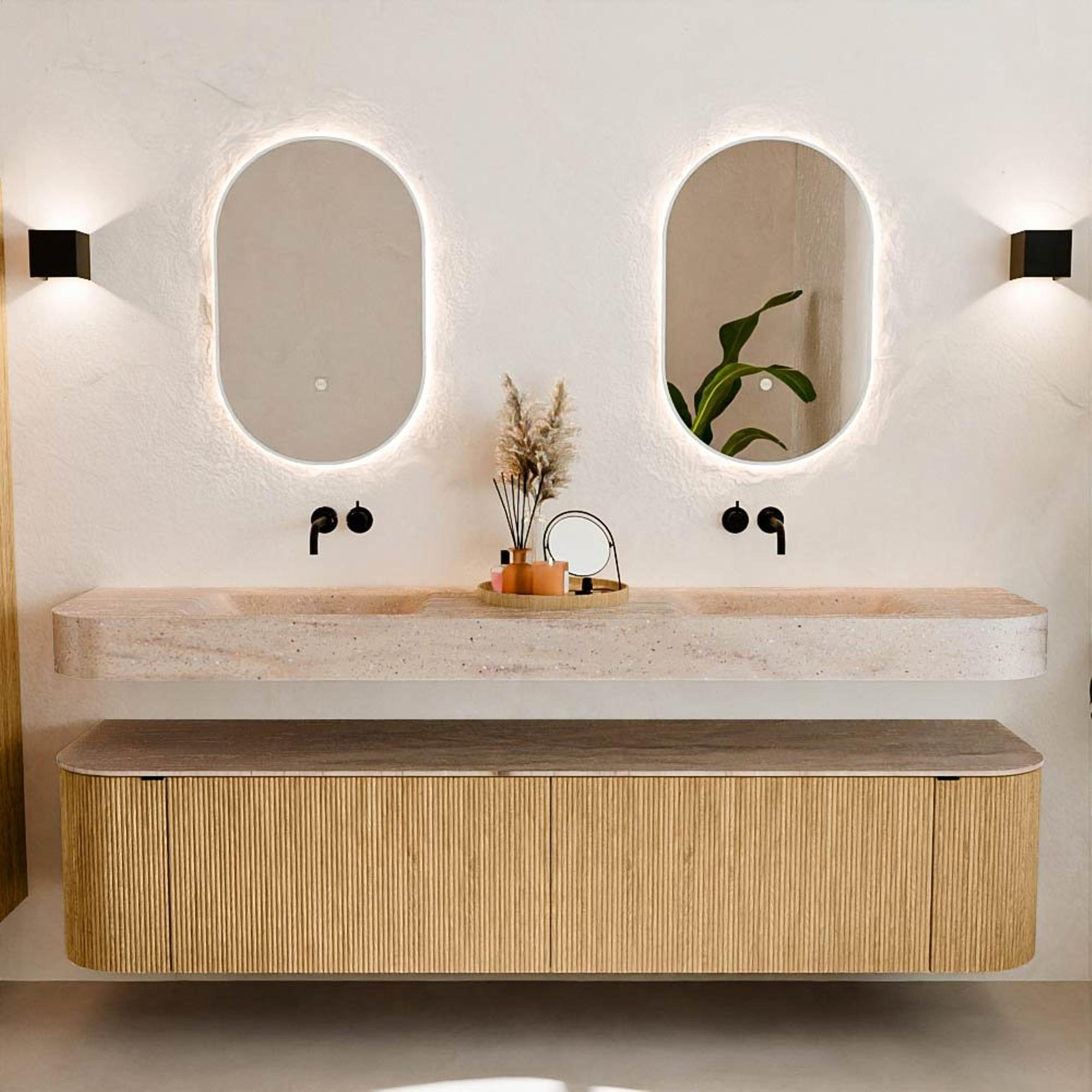 Natuurlijke materialen in warme tinten. De verticale ribbels brengen ritme en textuur in het ontwerp, terwijl het eikenhout zorgt voor een warme, ambachtelijke uitstraling. Kies uit 5 houttinten OAK, WALNUT, DUSK, SHADOW en RUBY zorgvuldig geselecteerde houtkleuren om zowel moderne als klassieke badkamers te verrijken.