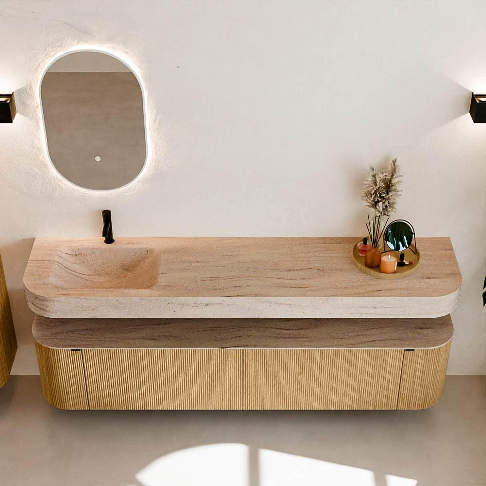 MONDIAZ THOR-DLUX 200cm badmeubel ronding links + rechts kleur Oak met 2 lades en 2 deuren. Vrijhangende wastafel CLOUD Links 1 kraangat kleur Saba.