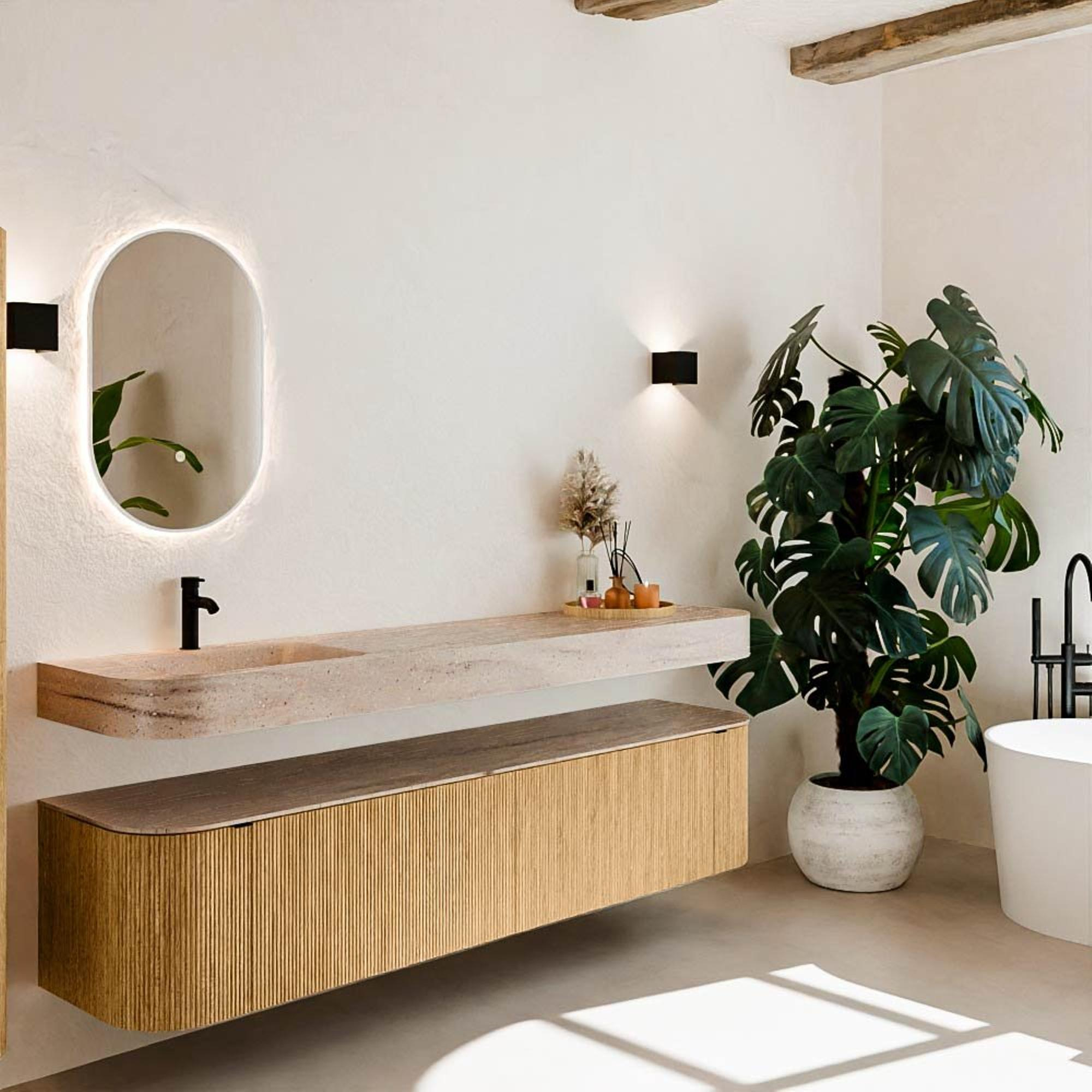 Natuurlijke materialen in warme tinten. De verticale ribbels brengen ritme en textuur in het ontwerp, terwijl het eikenhout zorgt voor een warme, ambachtelijke uitstraling. Kies uit 5 houttinten OAK, WALNUT, DUSK, SHADOW en RUBY zorgvuldig geselecteerde houtkleuren om zowel moderne als klassieke badkamers te verrijken.
