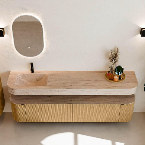 Boven het meubel zweeft een bijpassende, vrij hangende wastafel met afgeronde hoeken – perfect afgestemd op de vorm van de kast. De wastafel is uitgevoerd in Solid Surface en volgt subtiel de lijnen van het onderliggende meubel, waardoor een harmonieus geheel ontstaat. Het Solid Surface topblad vormt een sterke, onderhoudsvriendelijke basis en maakt de combinatie compleet.
