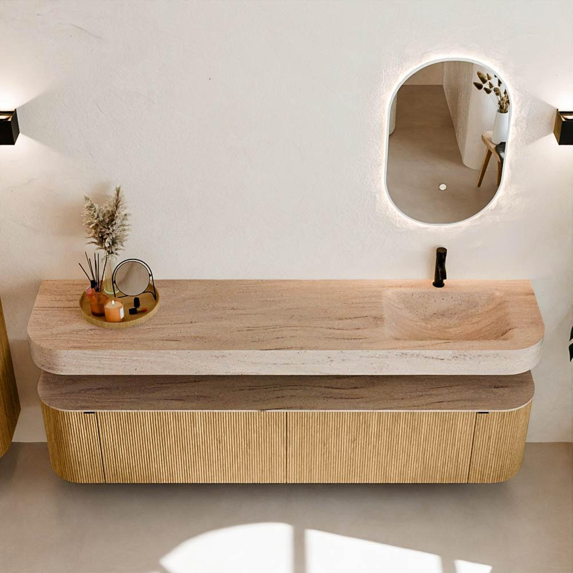 Natuurlijke materialen in warme tinten. De verticale ribbels brengen ritme en textuur in het ontwerp, terwijl het eikenhout zorgt voor een warme, ambachtelijke uitstraling. Kies uit 5 houttinten OAK, WALNUT, DUSK, SHADOW en RUBY zorgvuldig geselecteerde houtkleuren om zowel moderne als klassieke badkamers te verrijken.