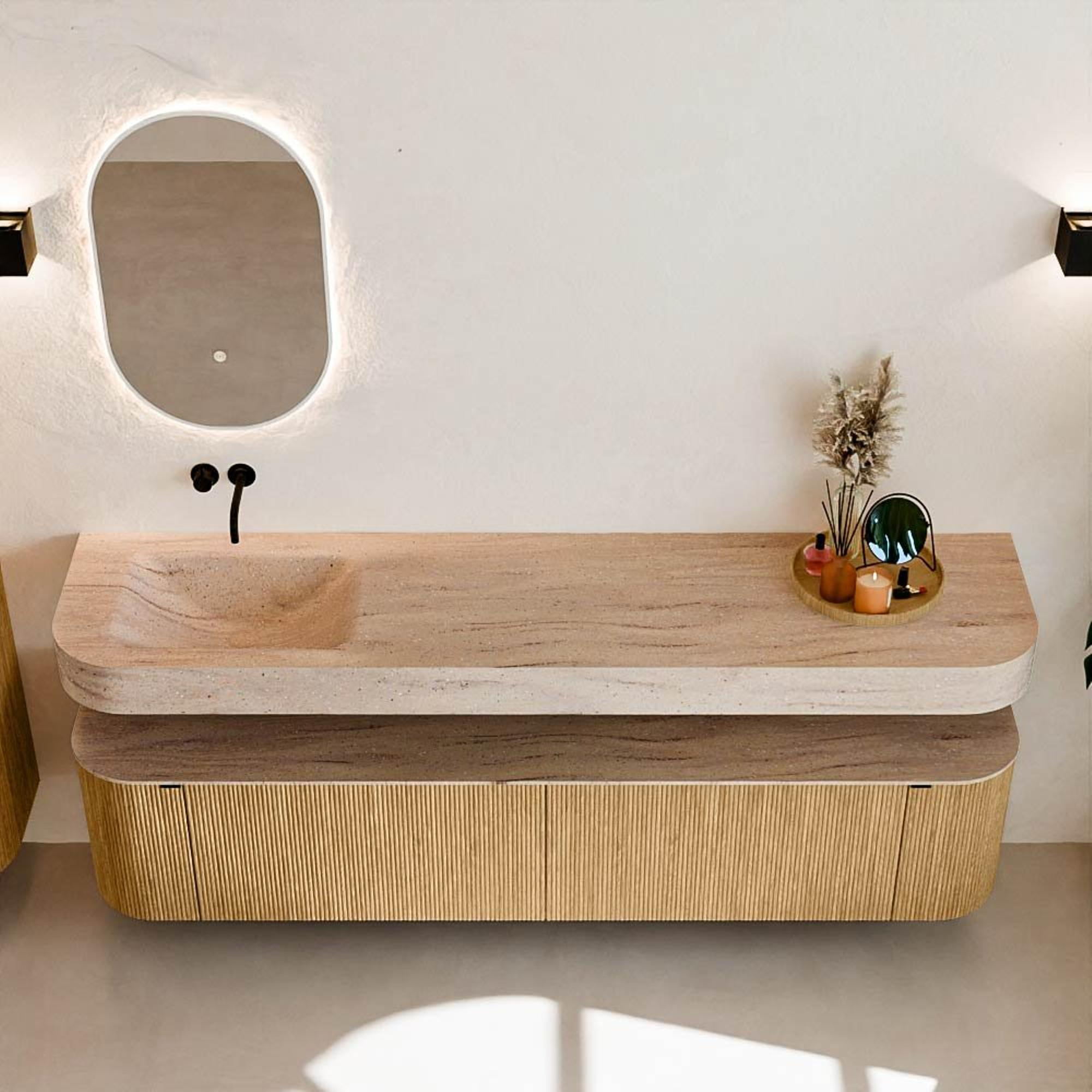 MONDIAZ THOR-DLUX 200cm badmeubel ronding links + rechts kleur Oak met 2 lades en 2 deuren. Vrijhangende wastafel CLOUD Links zonder kraangat kleur Saba.