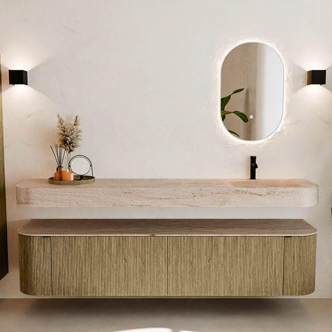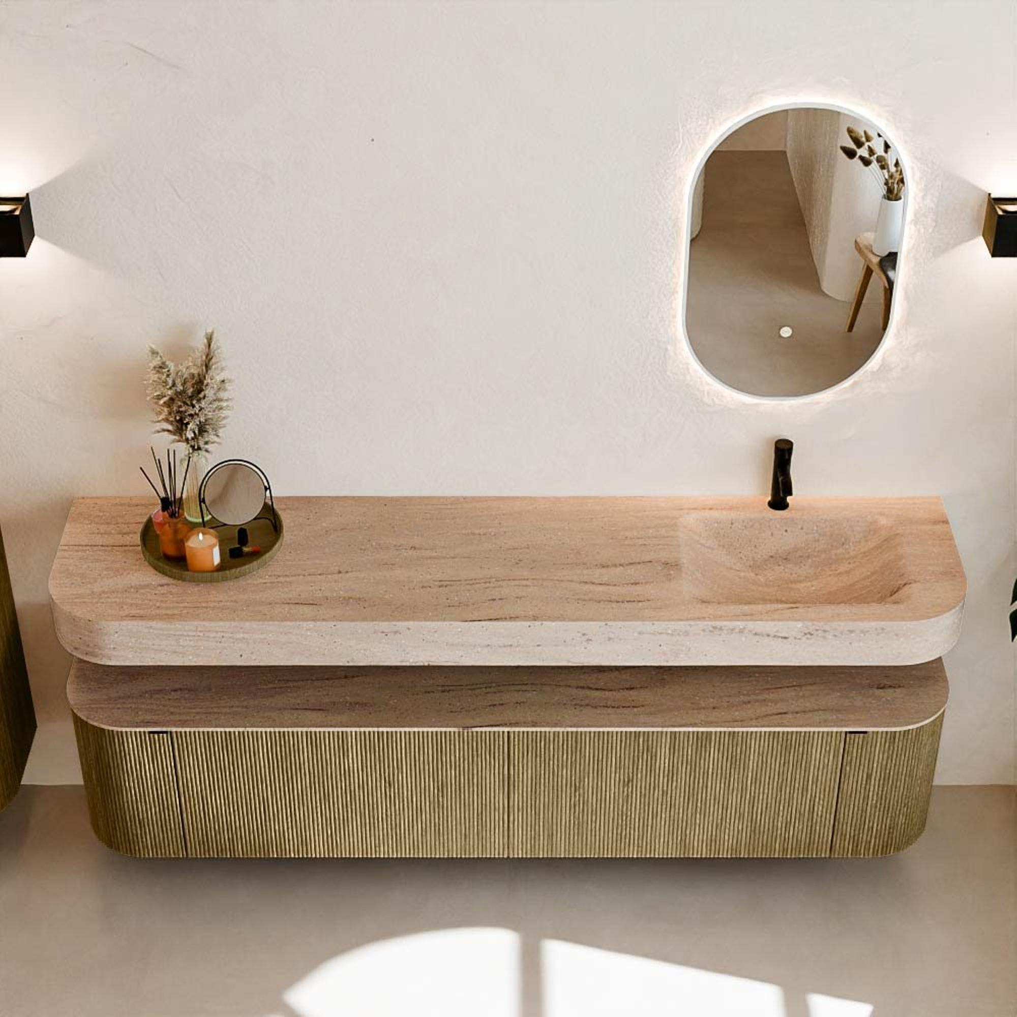 Natuurlijke materialen in warme tinten. De verticale ribbels brengen ritme en textuur in het ontwerp, terwijl het eikenhout zorgt voor een warme, ambachtelijke uitstraling. Kies uit 5 houttinten OAK, WALNUT, DUSK, SHADOW en RUBY zorgvuldig geselecteerde houtkleuren om zowel moderne als klassieke badkamers te verrijken.