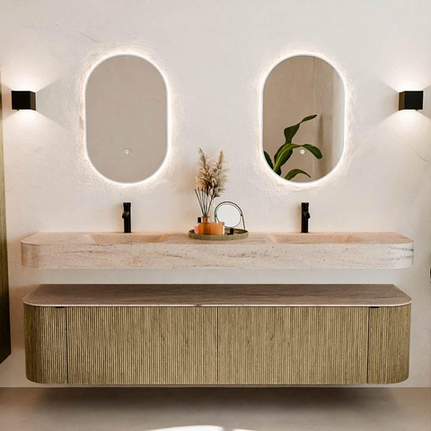 Natuurlijke materialen in warme tinten. De verticale ribbels brengen ritme en textuur in het ontwerp, terwijl het eikenhout zorgt voor een warme, ambachtelijke uitstraling. Kies uit 5 houttinten OAK, WALNUT, DUSK, SHADOW en RUBY zorgvuldig geselecteerde houtkleuren om zowel moderne als klassieke badkamers te verrijken.