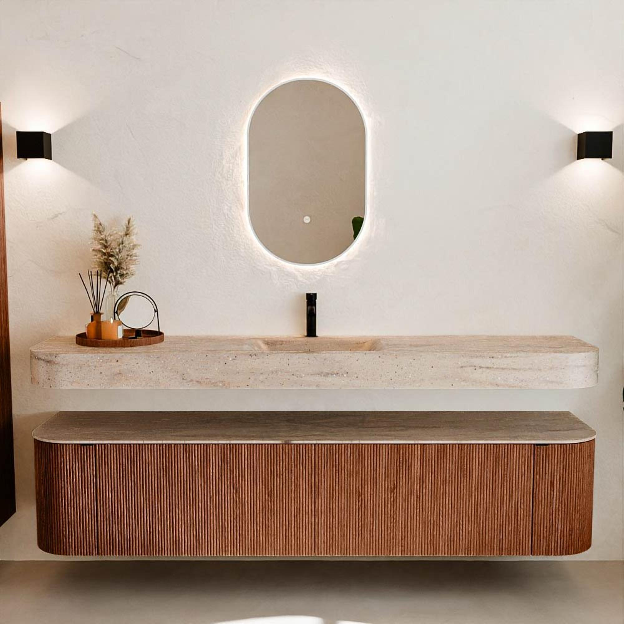 Natuurlijke materialen in warme tinten. De verticale ribbels brengen ritme en textuur in het ontwerp, terwijl het eikenhout zorgt voor een warme, ambachtelijke uitstraling. Kies uit 5 houttinten OAK, WALNUT, DUSK, SHADOW en RUBY zorgvuldig geselecteerde houtkleuren om zowel moderne als klassieke badkamers te verrijken.